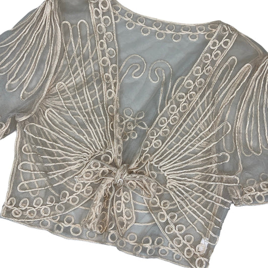 Vintage Y2K Cream Floral Embroidered Crop Tie-Top Bolero Blouse 6 8 XS