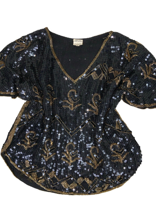 Vintage Black Sequin Gold Bead Blouse Top M L 14 16