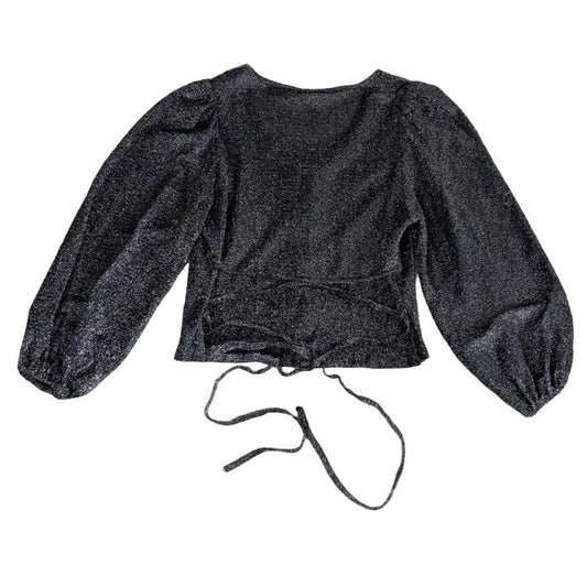Silver Black Balloon Sleeve Crop Blouse Top S 10 12