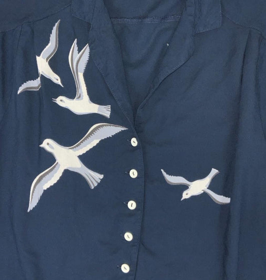 'EIKONT' NAVY BLUE SEAGULL BIRD GRAPHIC SHORT SLEEVED BUTTON-UP BLOUSE S 10