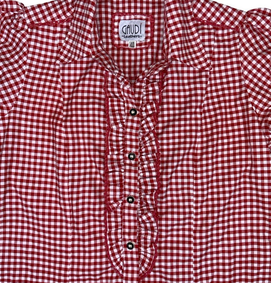 VTG 90s GAUDI LEATHERS RED WHITE GINGHAM RUFFLE BUTTON-UP BLOUSE SHIRT M 12 14