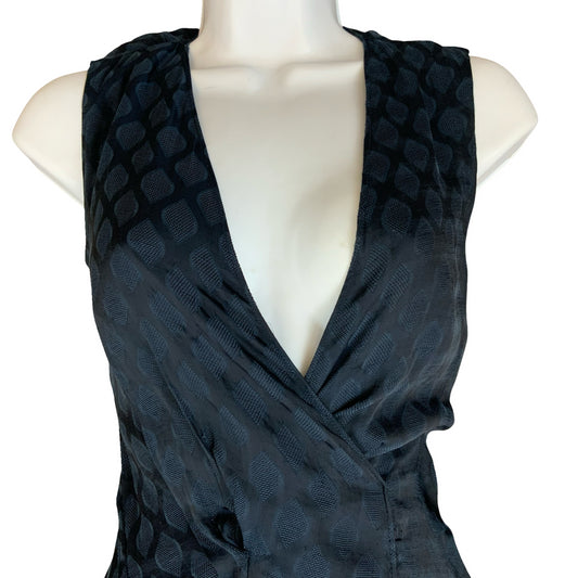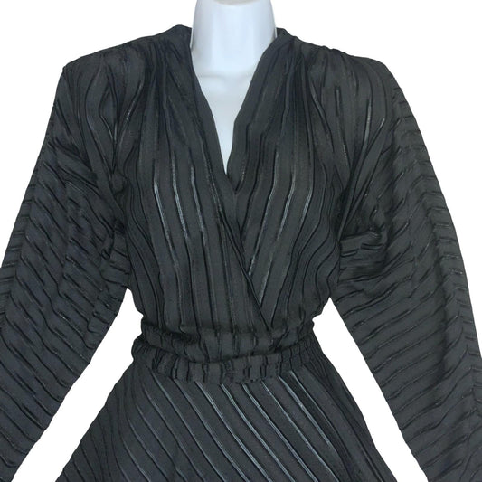 Vtg Black Wrap-Style V-Neck Textured Stripe Belted A-Line Midi Party Dress UK 8