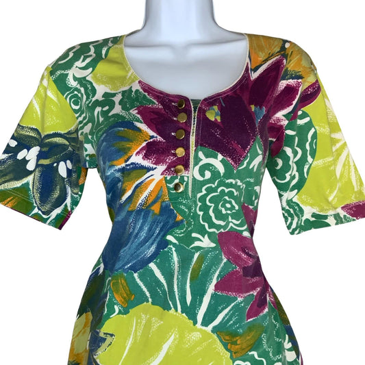 Vtg 'Les Copains' Green Purple Colourful Floral Mini Figure-Hugging Dress UK 10