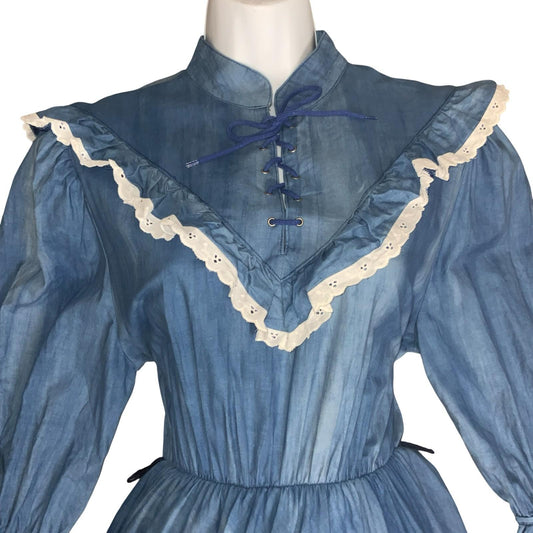 Vtg 90s 'Yessica' Blue A-Line Prairie White Frill Victorian Cottage Dress UK 10