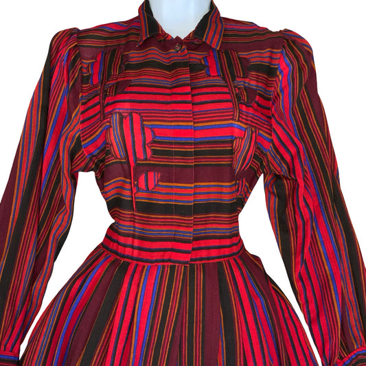 VTG 80s 'BOGNER' RED BLUE BLACK STRIPE FLORAL EMBROIDERED AUTUMNAL DRESS UK 8/10
