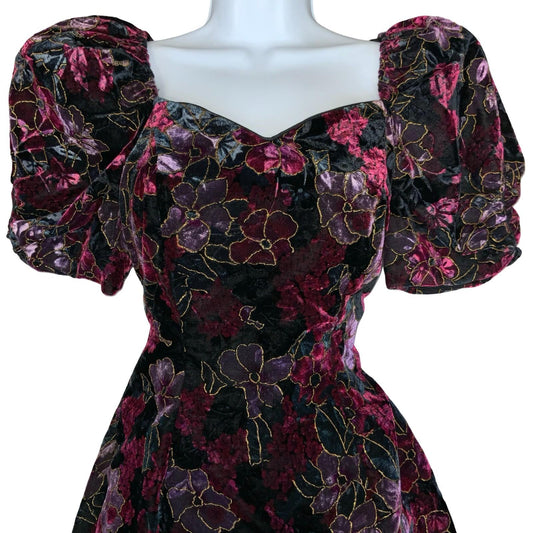 Vtg 80s 'Paris Sport Club' Velvet Purple Black Floral Puff Sleeve Mini Dress 10