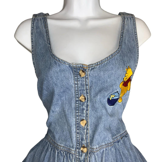 90s Y2K 'The Disney Store' Blue Winnie the Pooh Embroidered Denim Dress UK 10/12