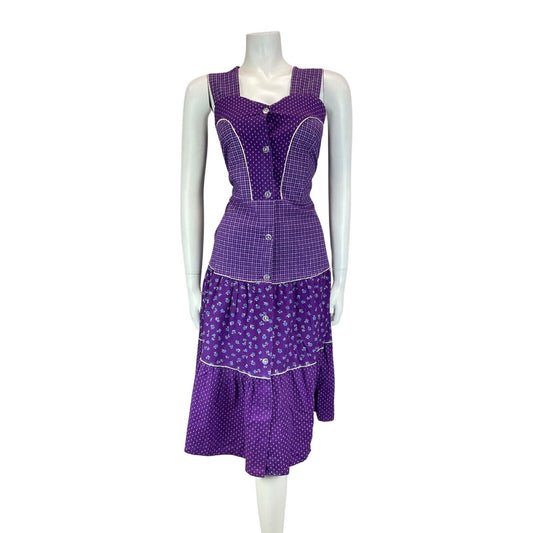 Vintage 90s 70s Style Purple White Prairie Floral Checked Midi Dress 8 10S
