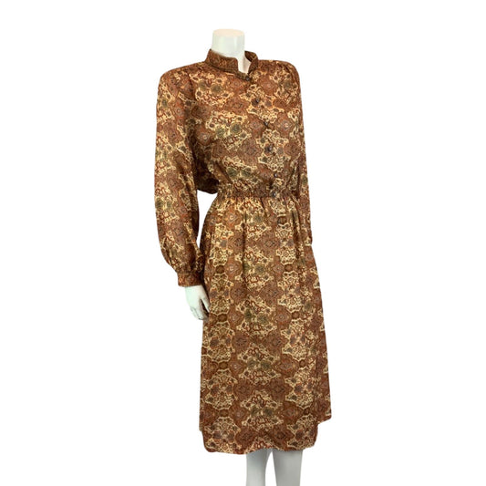 Vintage 80s Brown Louis Feraud Ornamental Patterned Modest Midi Dress M/L 14-16