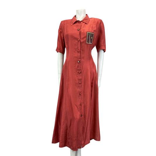 Vintage 80s 90s Red Lily Farouche Short Sleeve Maxi Button Up Silk Shirt Dress L