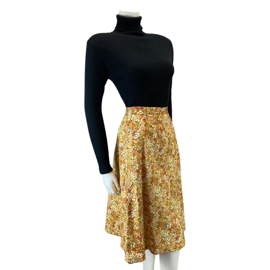 VINTAGE 70S YELLOW ORANGE BEIEGE PAISLEY FLORAL SWING MIDI SKIRT 8 10 S