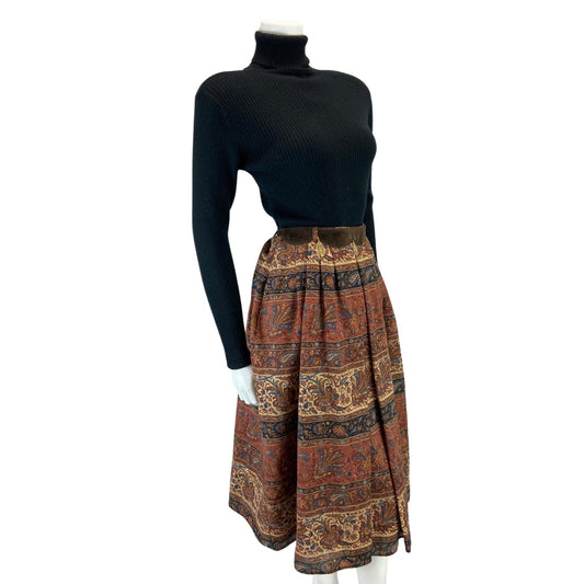 VINTAGE 70S 80S BROWN RED BETTY BARCLAY PAISLEY FLROAL BELTED WOOL MIDI SKIRT 8