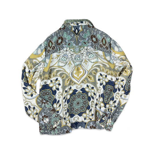 Vintage 90s Y2K Abstract Floral Print White, Teal, Blue, and Beige Shirt Blouse
