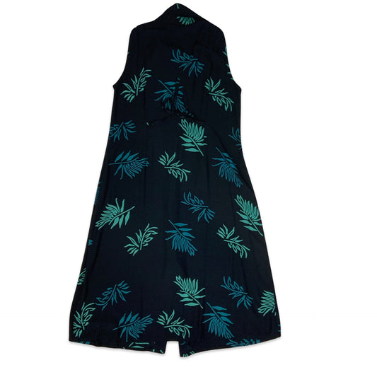 Y2K Black & Teal Botanical Print Sleeveless Button-up Maxi Dress 14 16