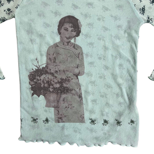 Vintage Y2K Blue Turquoise Floral Mesh Sheer Graphic Print Top 8 10 S