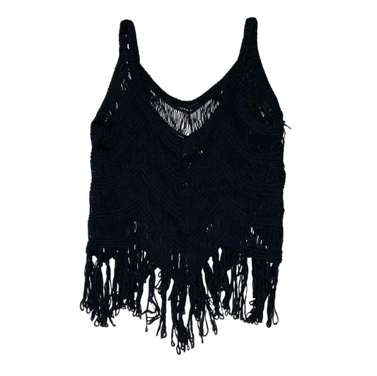 90s Y2K BLACK CROCHET TASSEL CHEVRON FESTIVAL BOHO TANK VEST TOP M 12
