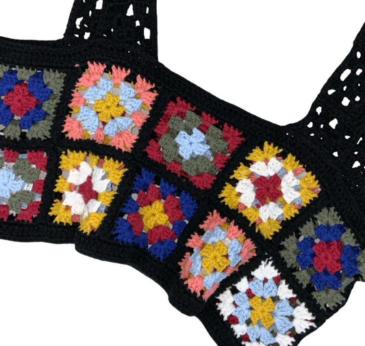 90s Y2K BLACK MILTI-COLOURED GRANNY SQUARE CROCHET BOHO CROP TANK TOP SMALL 8