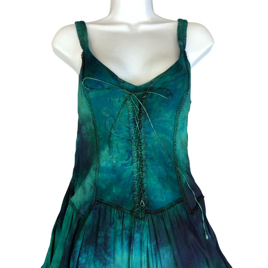 VTG 90s y2k 'MCL' GREEN BLUE BLACK TIE-DYE HIPPIE BOHO SUMMER BEACH DRESS S 10
