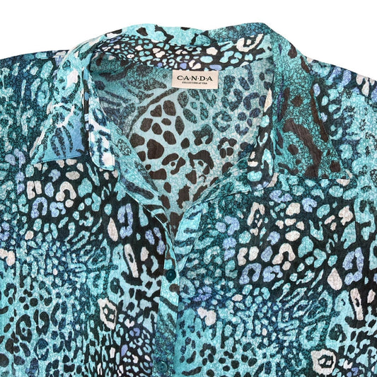 VTG 90s Y2K 'CANDA' COLLECTION AT C&A BLUE LEOPARD PRINT PLEATED MESH BLOUSE L