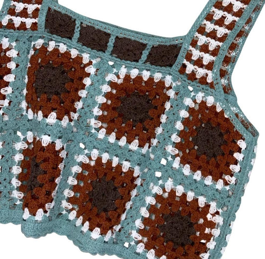 VTG 90s y2k 'SPRAY PREMIUM' BLUE BROWN CROCHET FESTIVAL BOHO TANK VEST TOP XS 6
