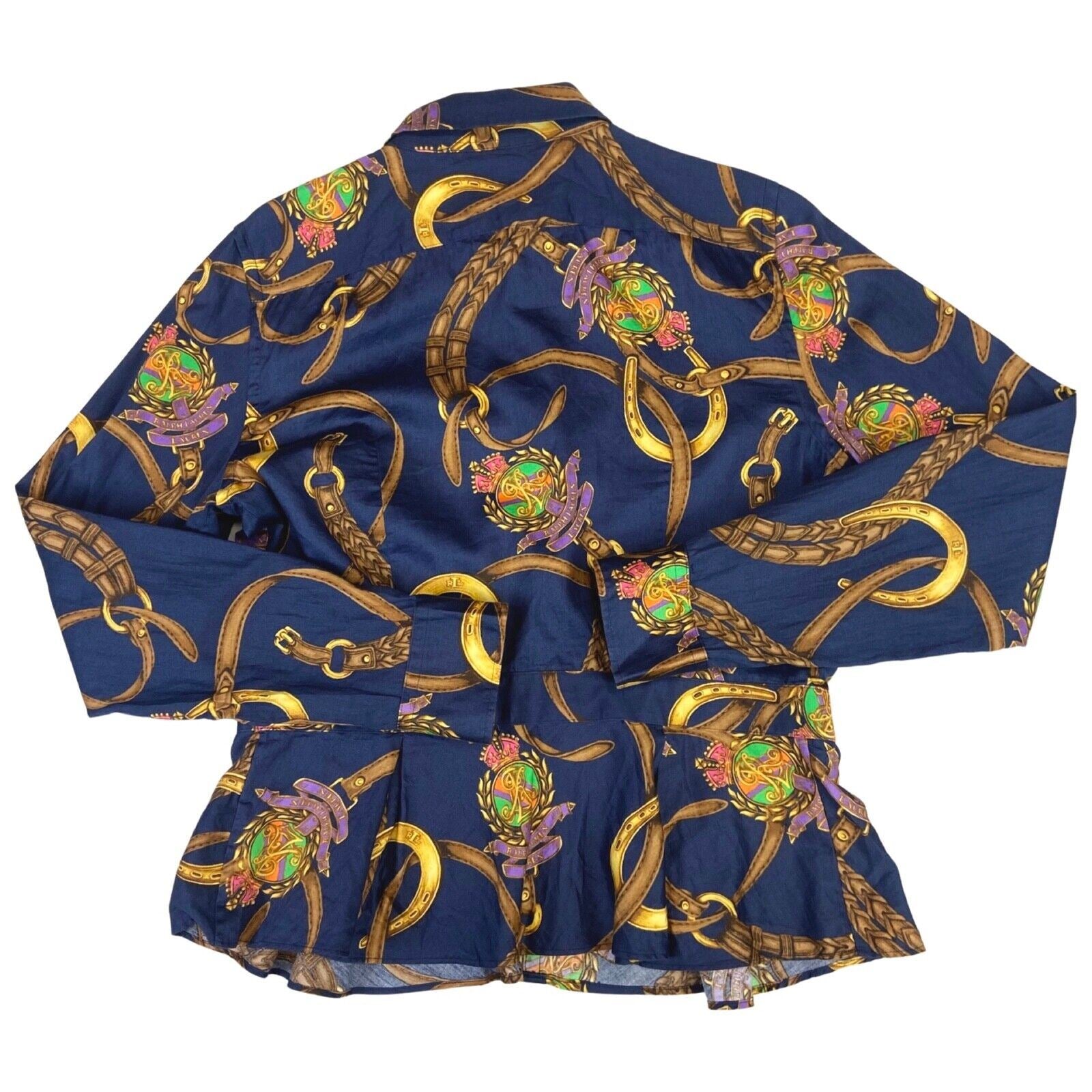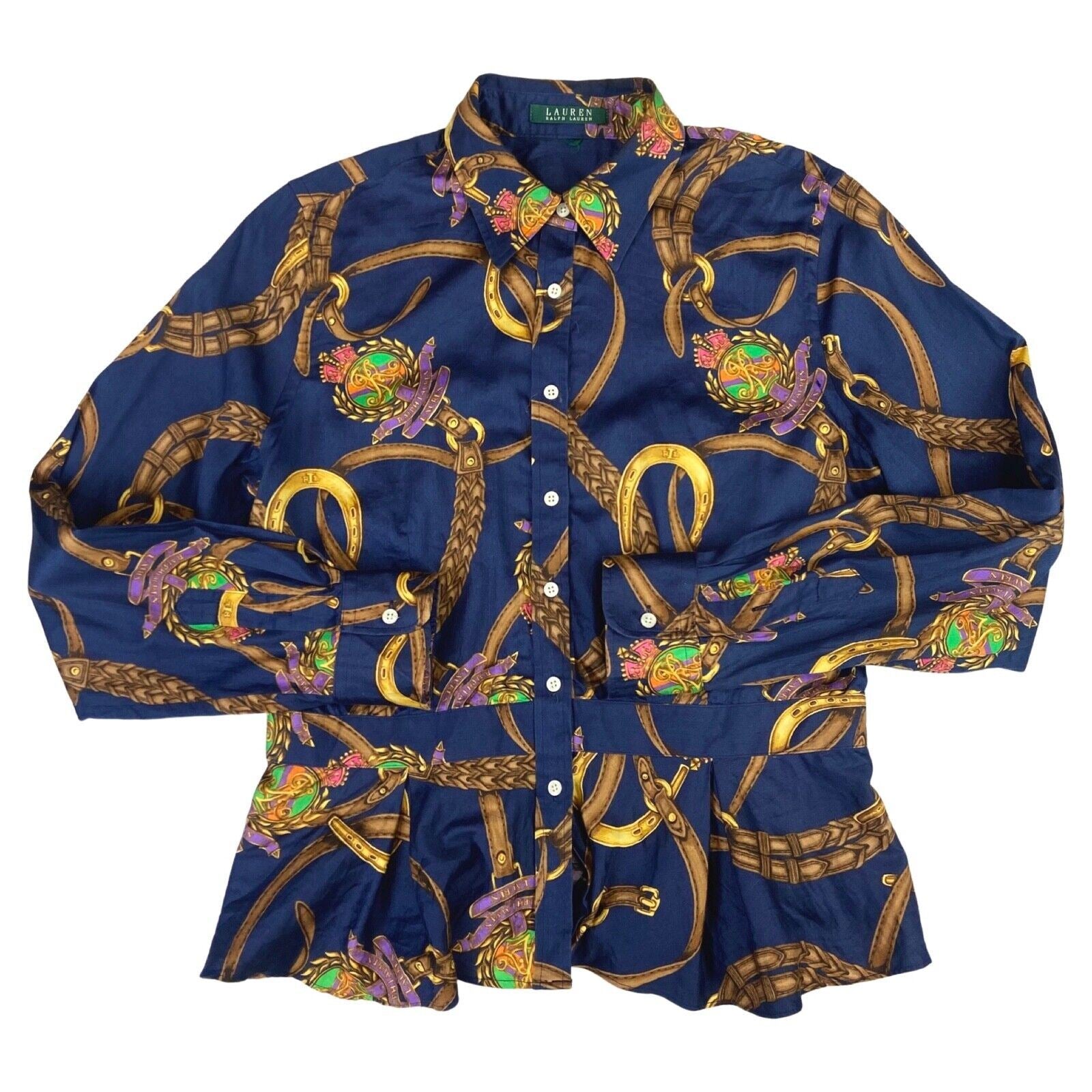 00s Blue Gold Belt Buckle Ralph Lauren Dagger Collar Peplum Blouse 12 14 M