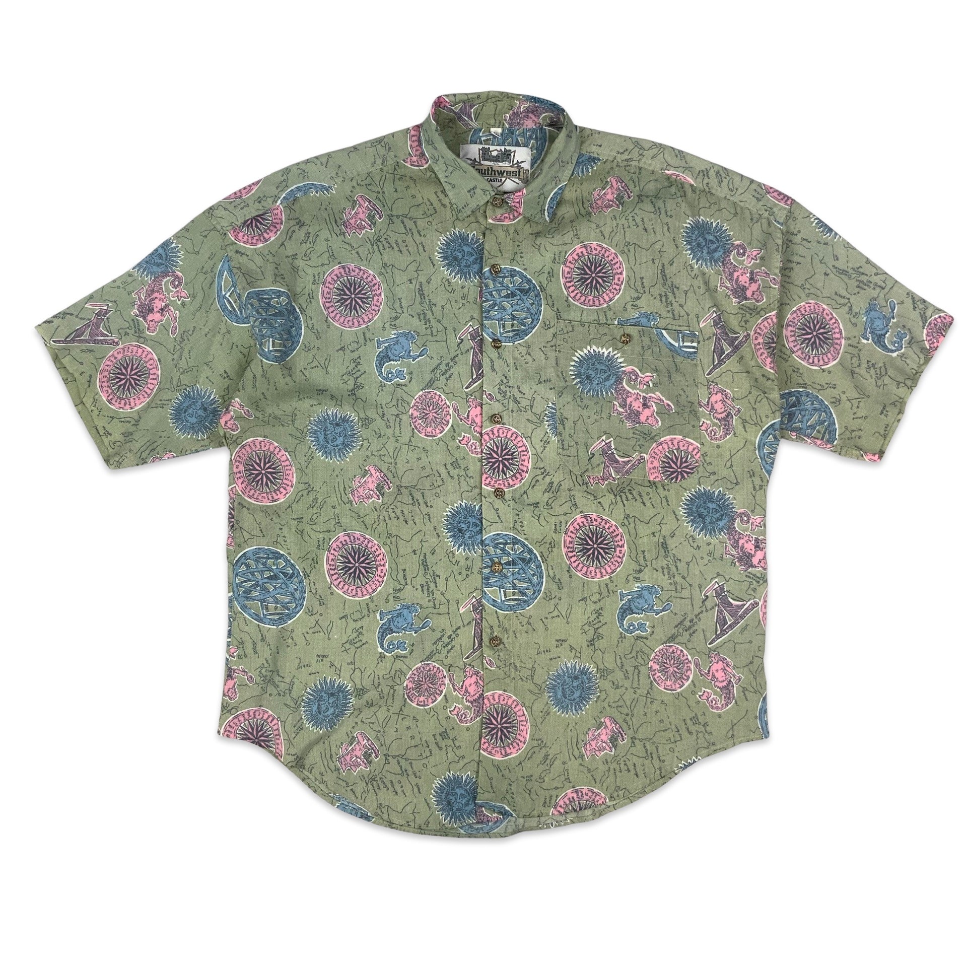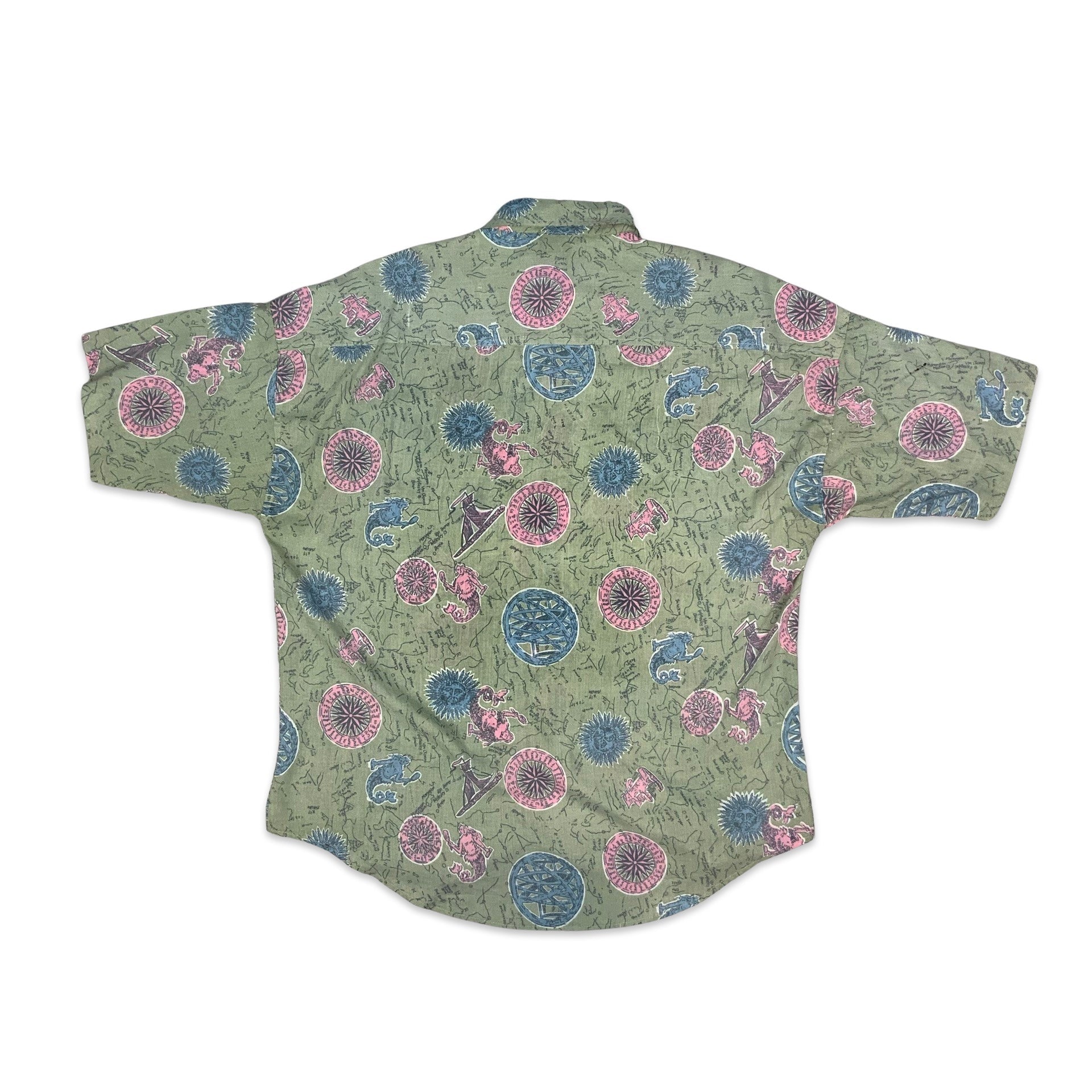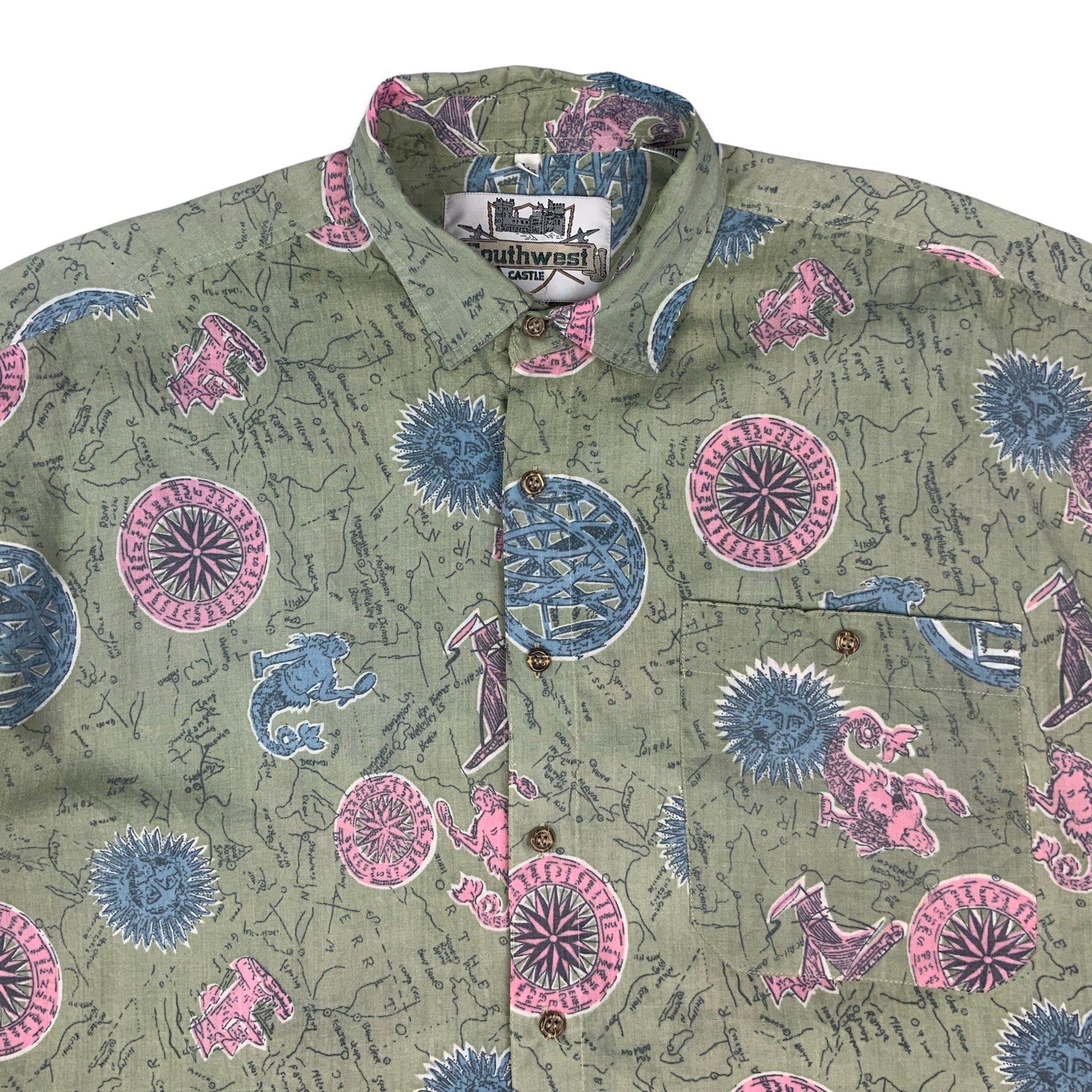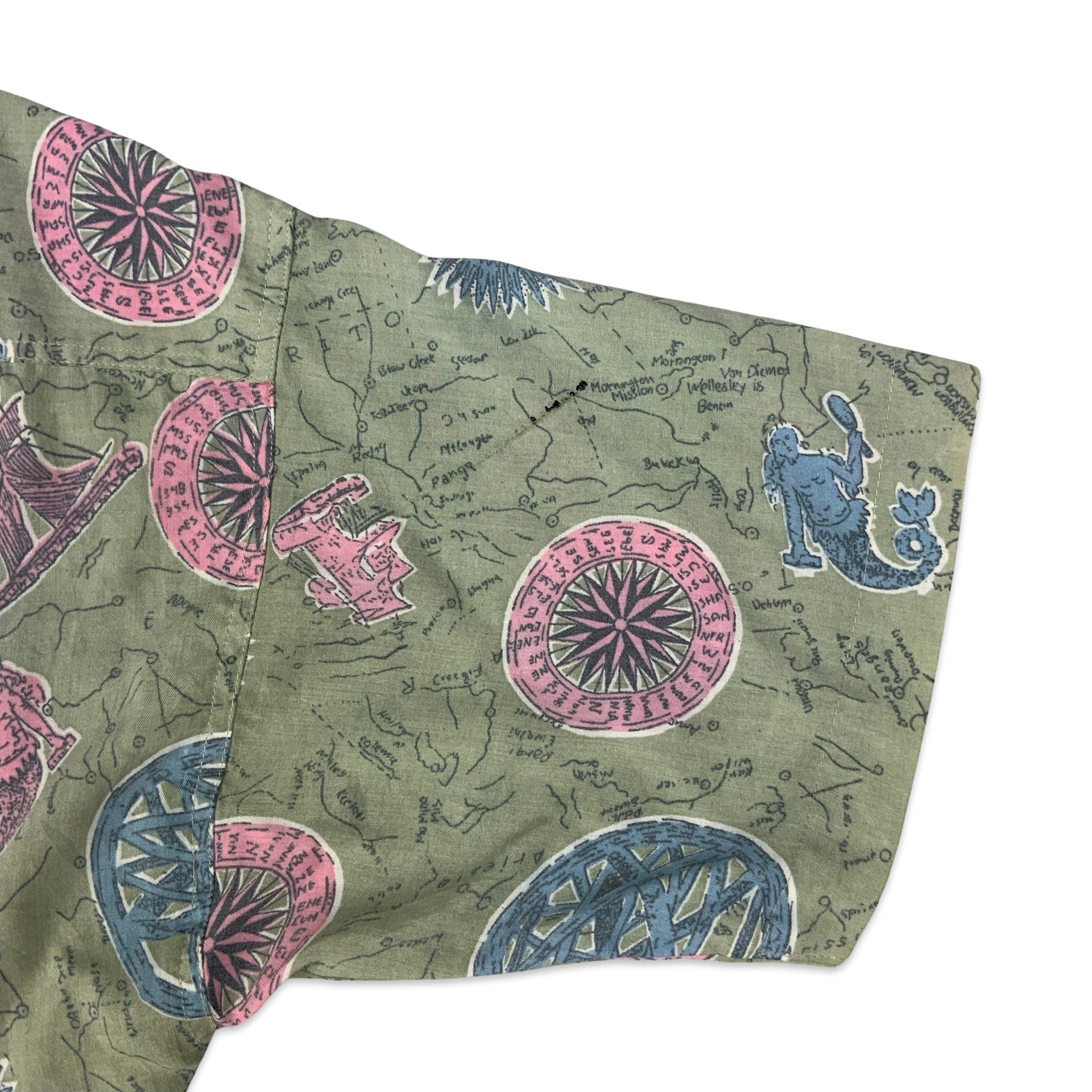 Men’s 1980s short sleeve shirt. Khaki green with baby blue & pink sea themed print. Polyester & viscose mix. Small mark on sleeve, can be seen in last photo.