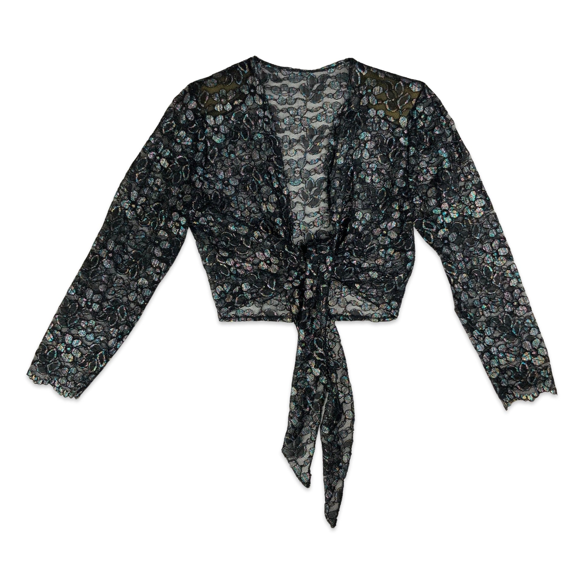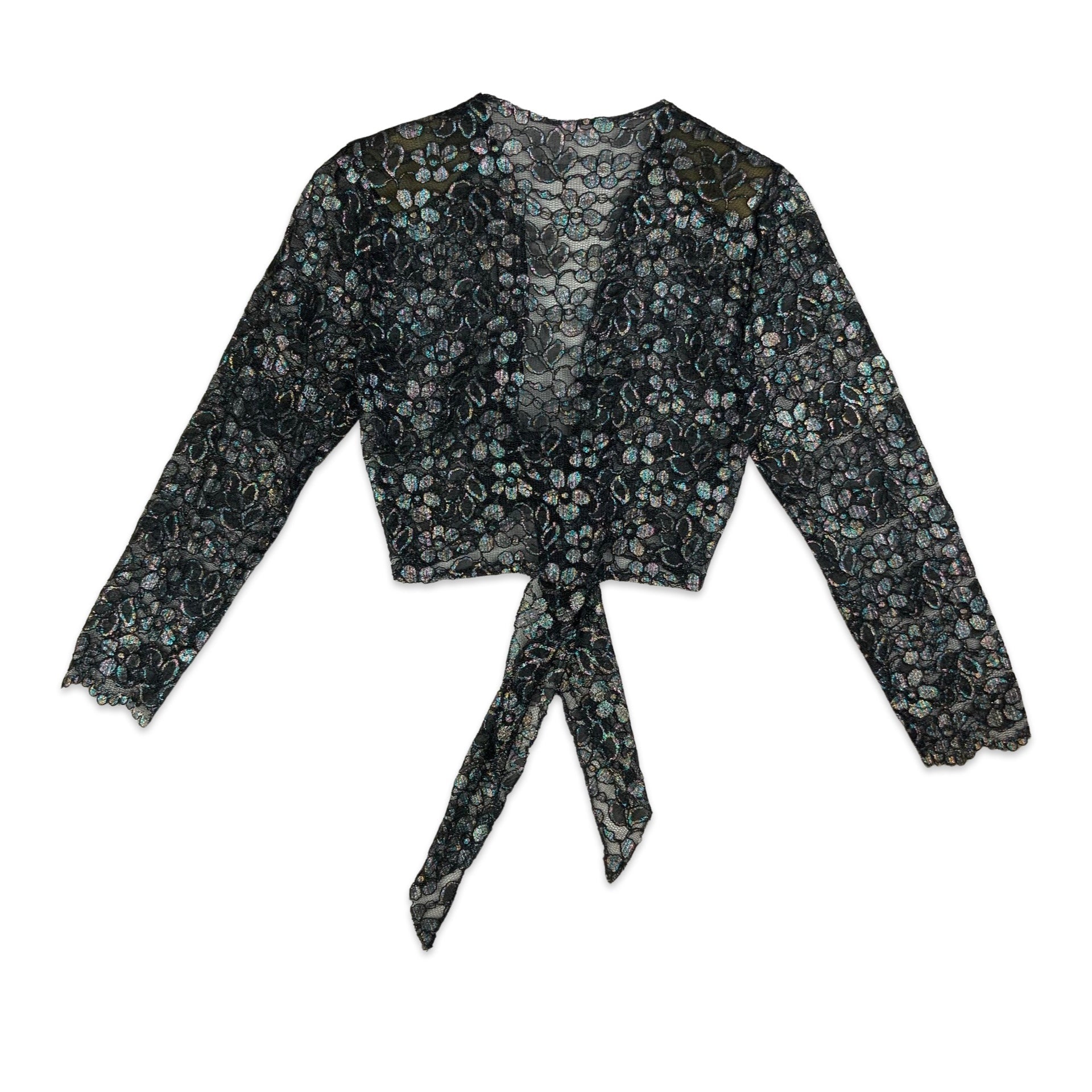 Women’s 1980s cropped tie cardigan.Black floral netted fabric with metallic flowers. Has shoulder pads.