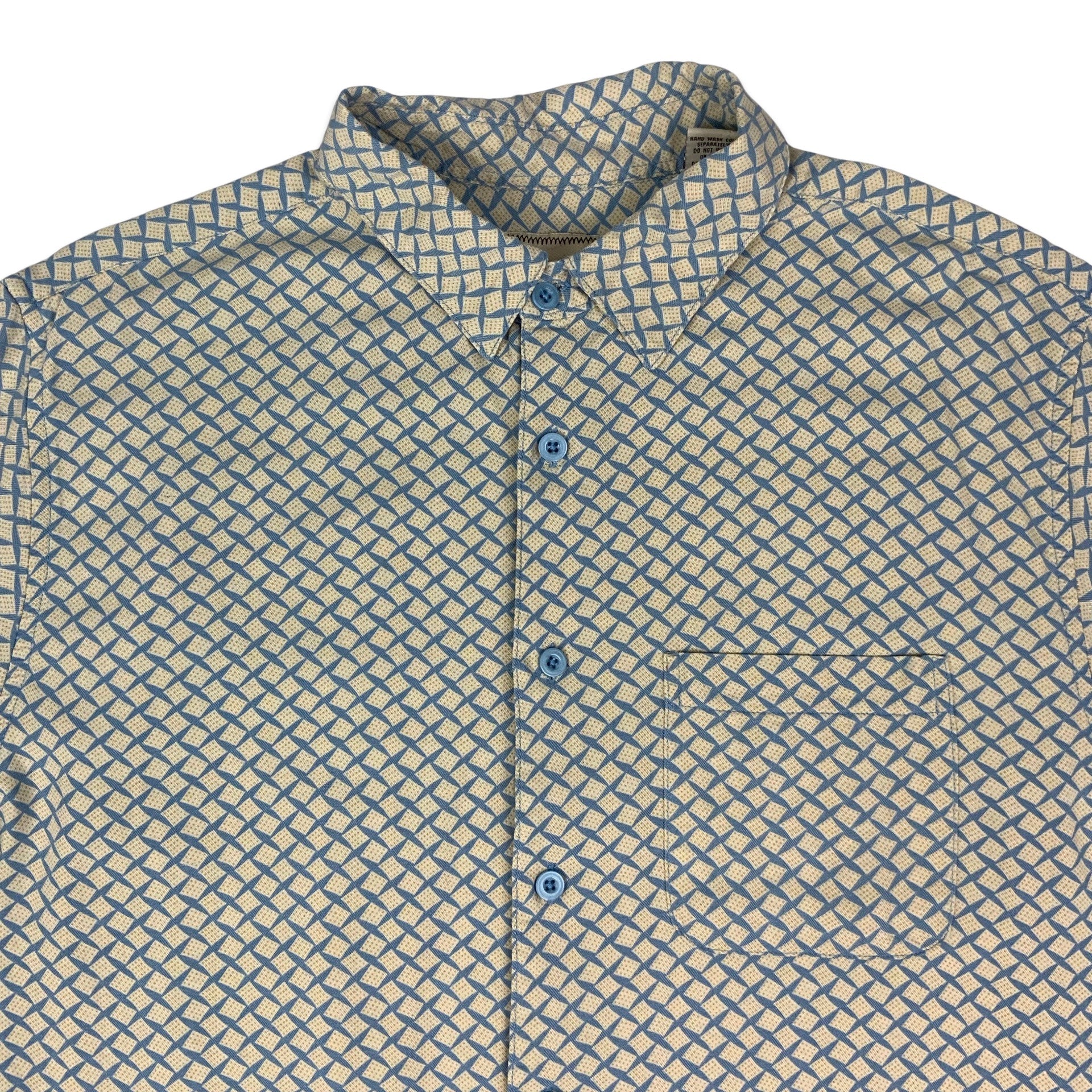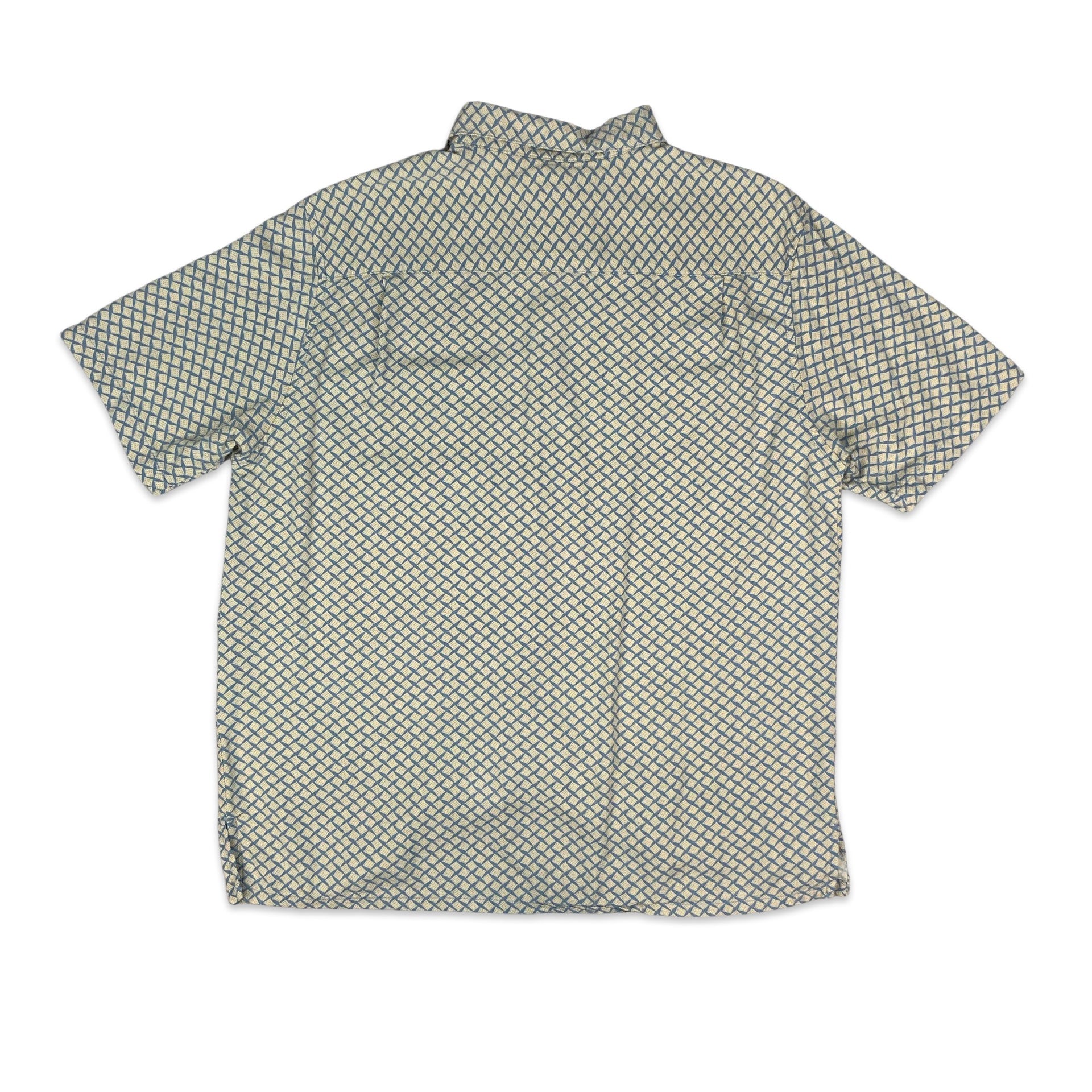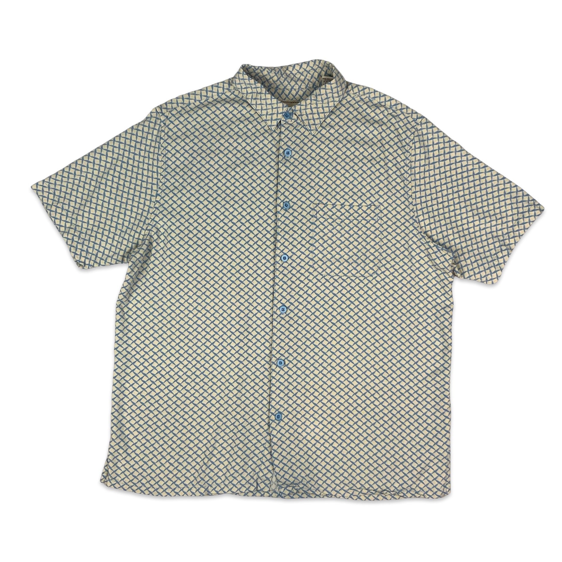 Men’s 1980s short sleeve shirt. Blue with beige diamond print and baby blue buttons. 55% Silk 45% Rayon.