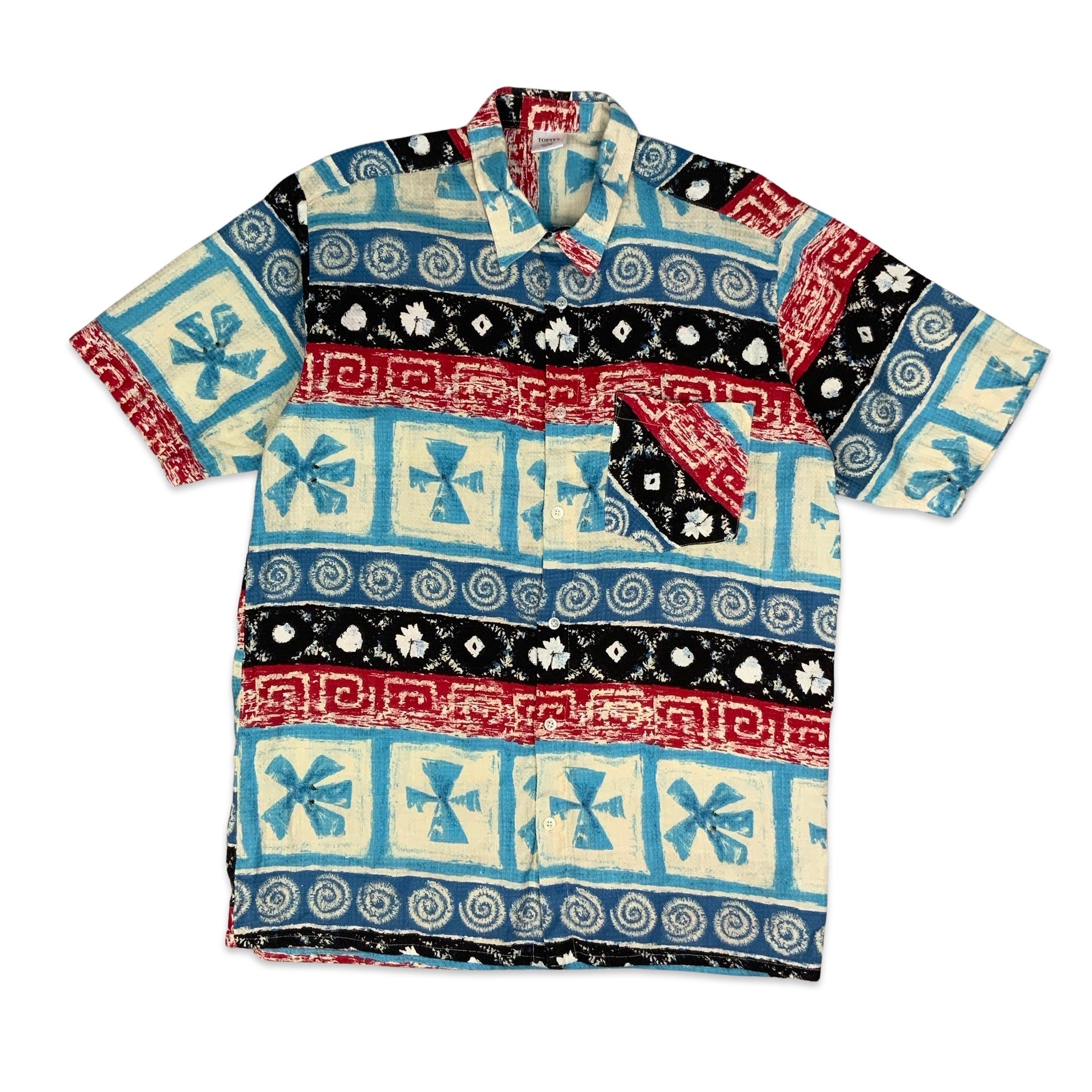 Men’s 1980s short sleeve shirt. Abstract print in blue, white, black & red.