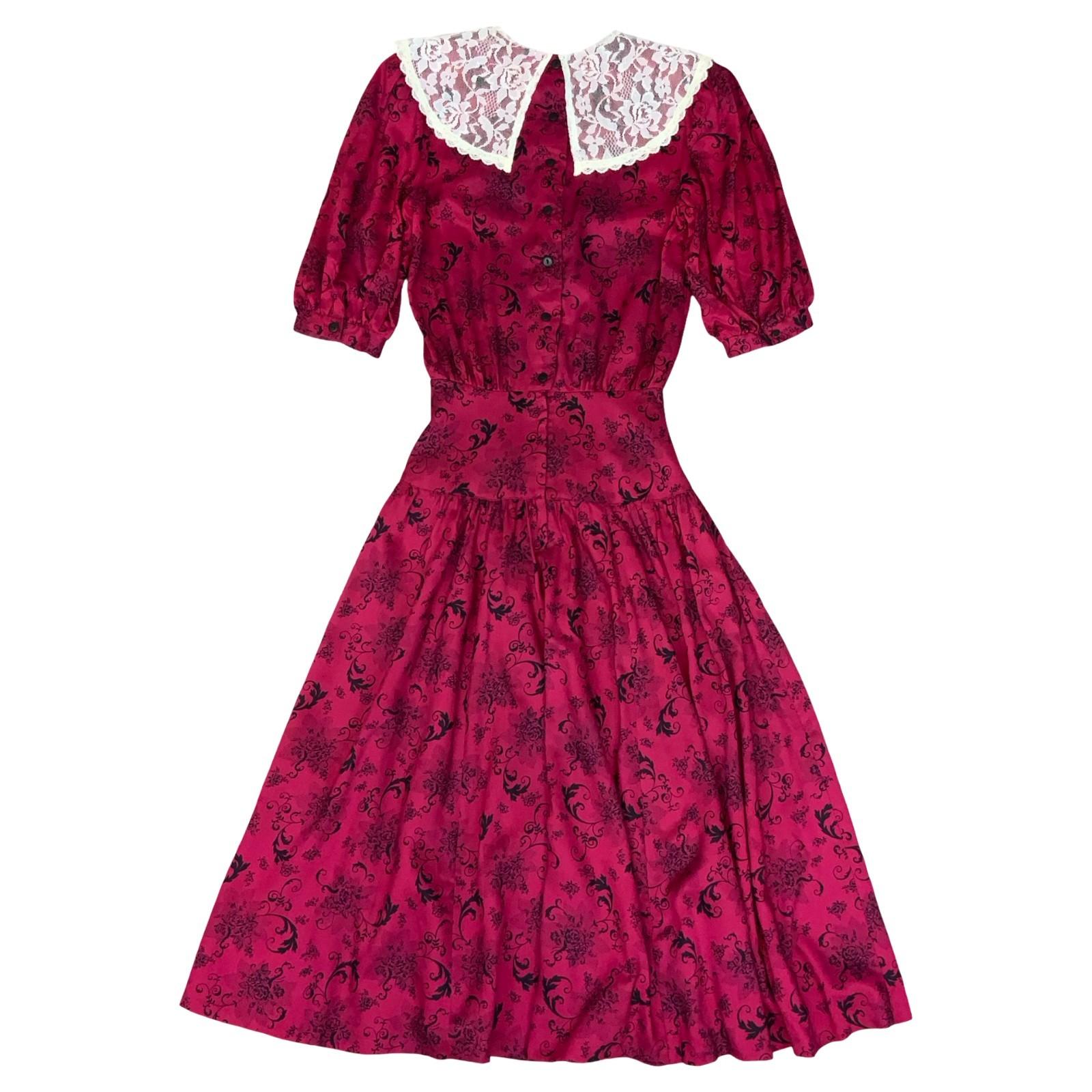 80s 'Gunne Sax' by Jessica McClintock Red Black Floral Ivory Lace Dress UK 6/8
