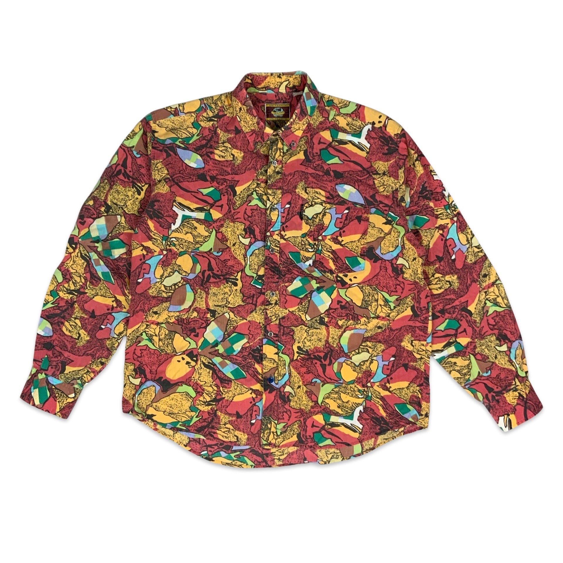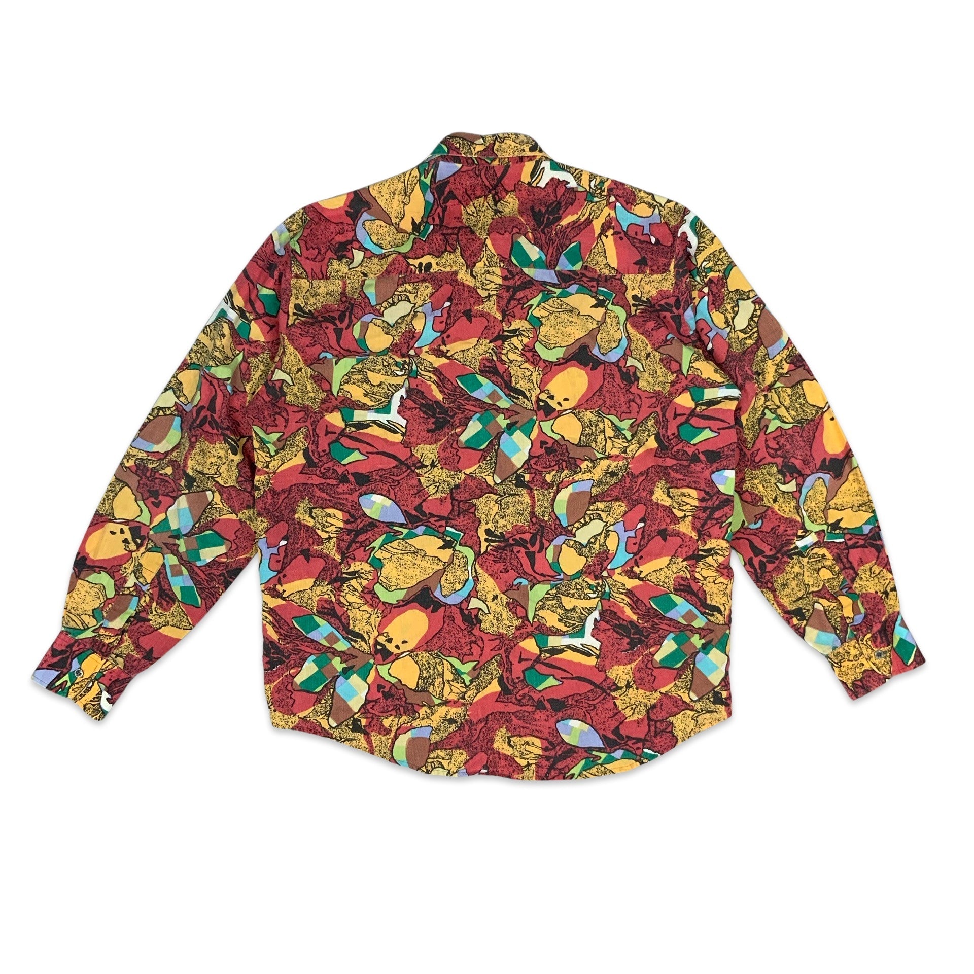 Men’s 1980s long sleeve shirt. Abstract print in red, yellow, purple, blue & green with grey buttons.