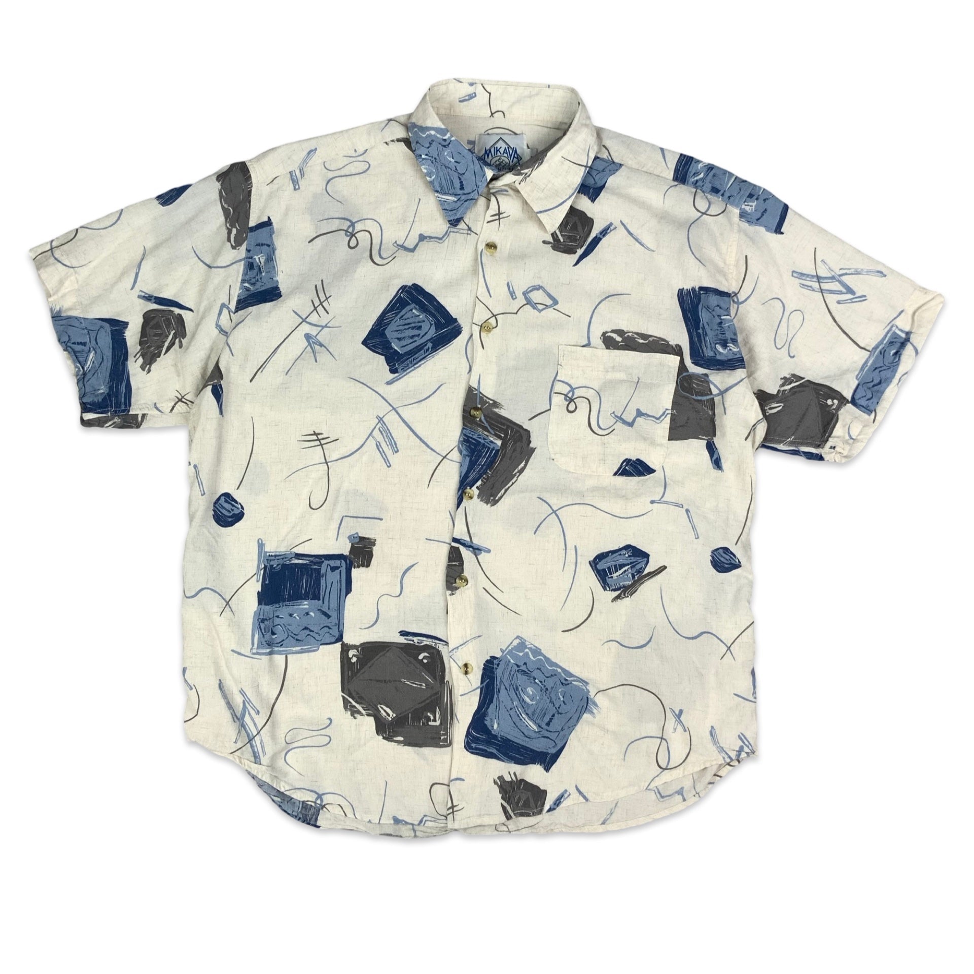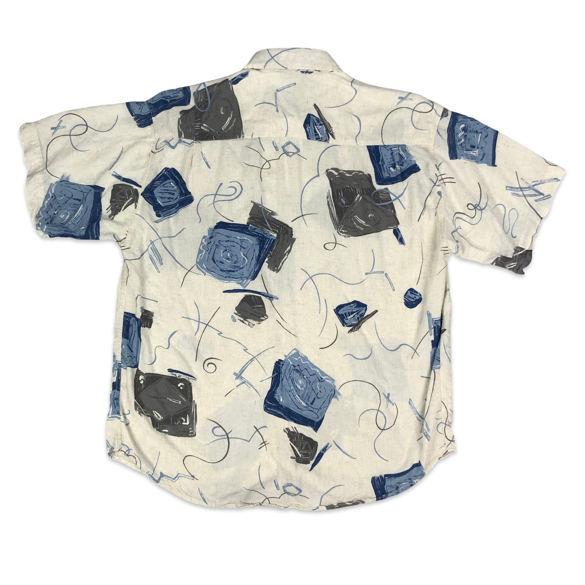 Men’s 80s short sleeve shirt. White with grey & blue abstract print. Viscose & linen mix.