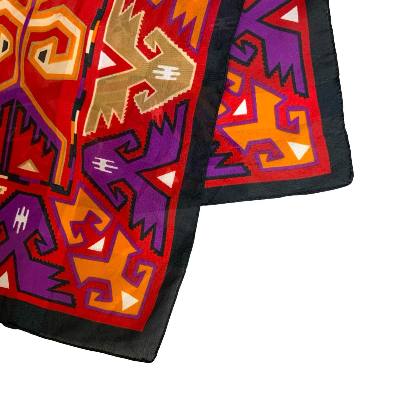 Vintage 1990s square scarf in purple, orange, and red featuring a main aztek design un the centre and a black border. Made from 100% polyester in Italy.