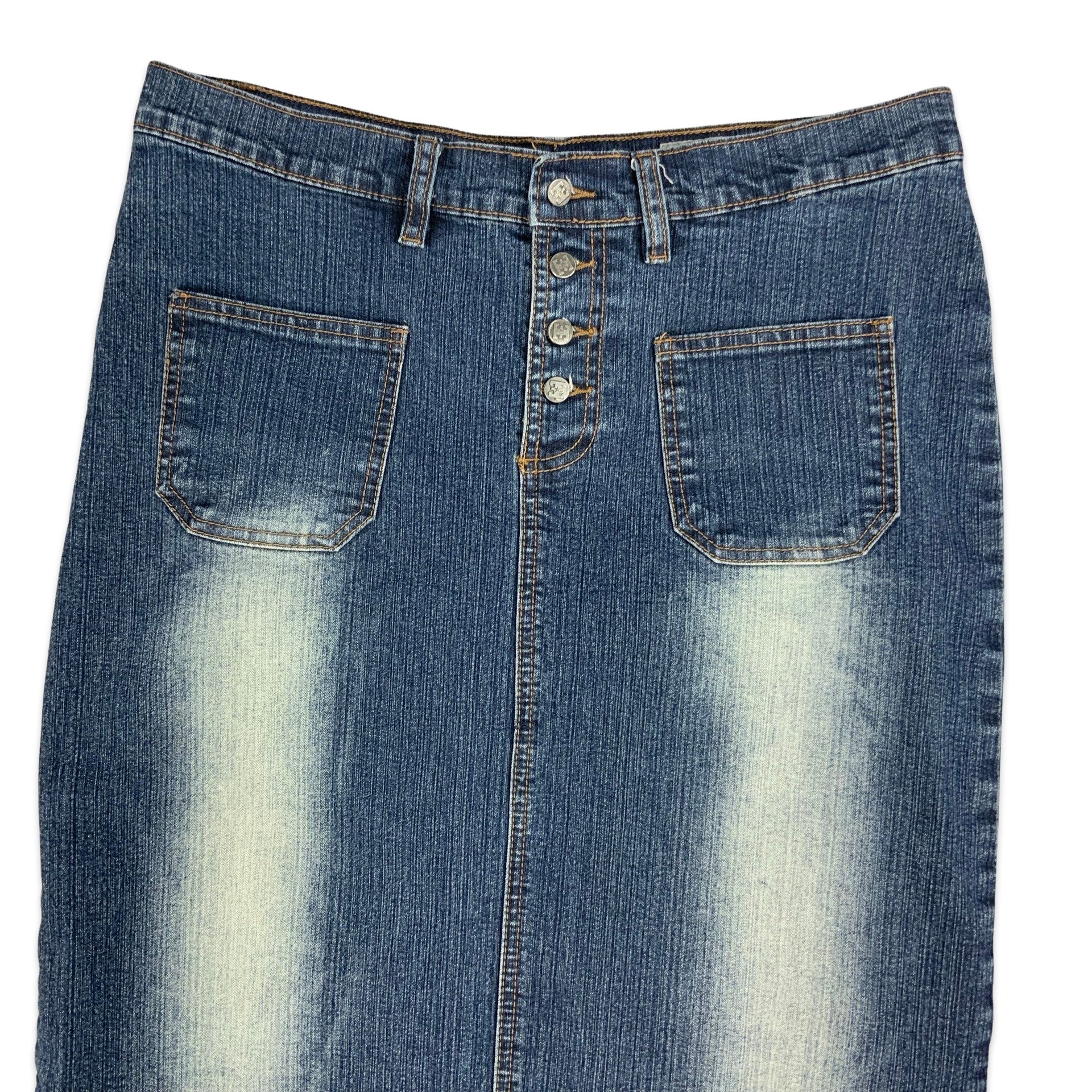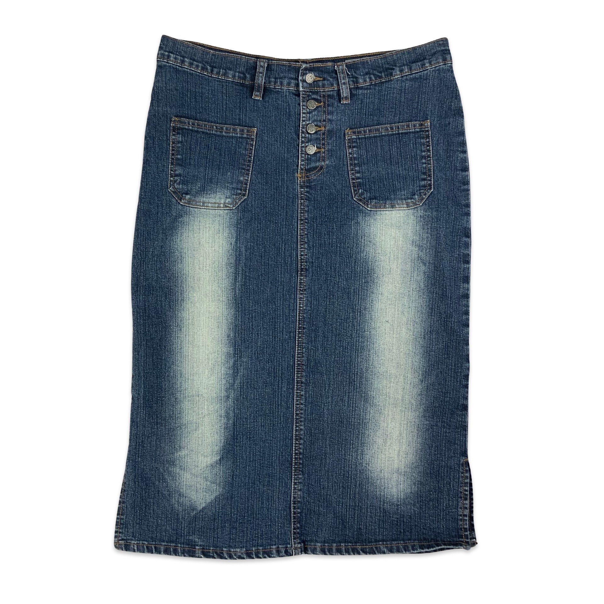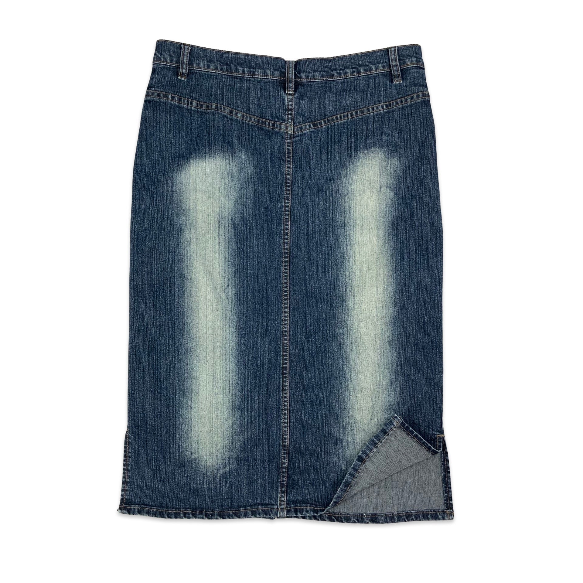 Women’s 90s Y2K denim midi skirt. 4 front button fastening. Dark denim with bleached patches.