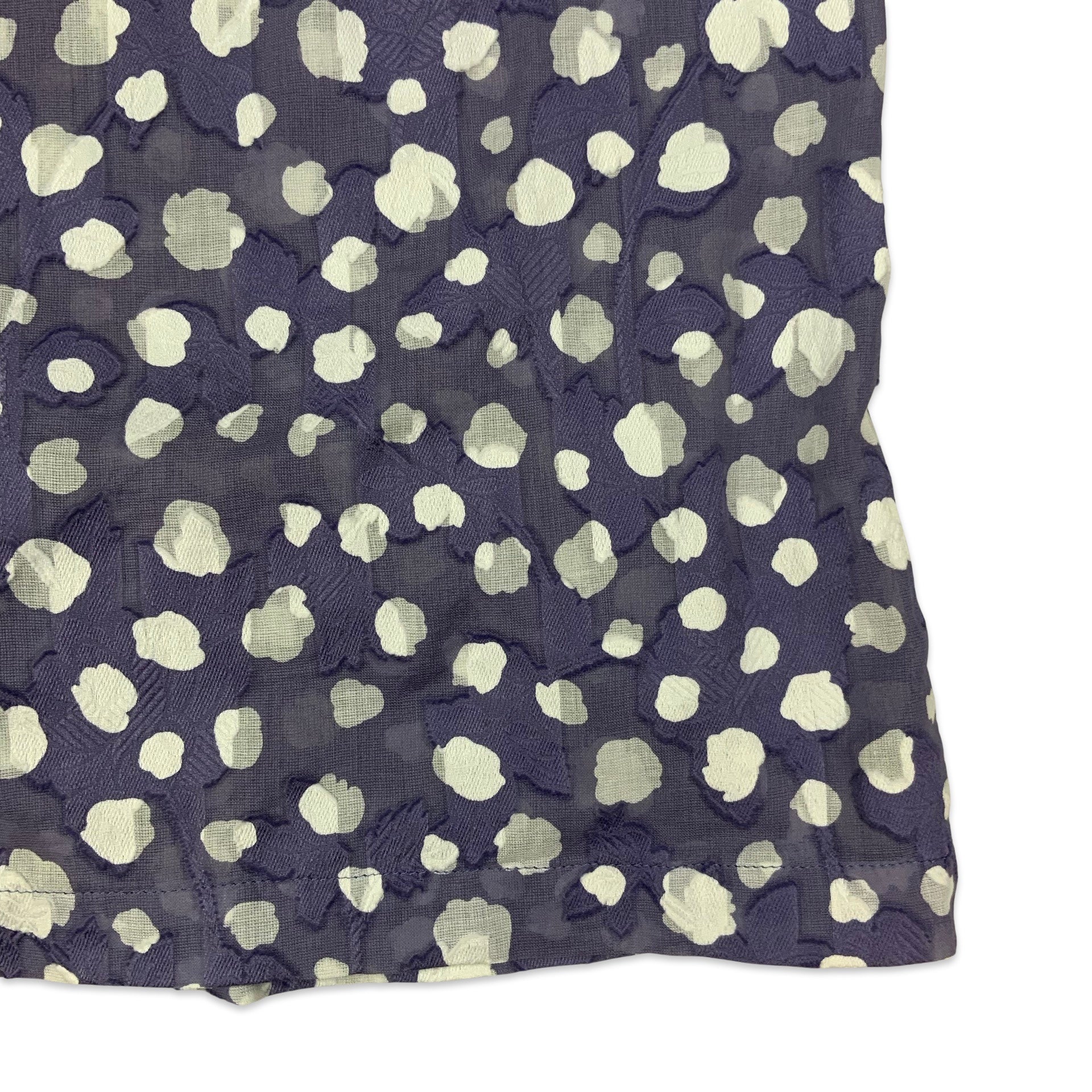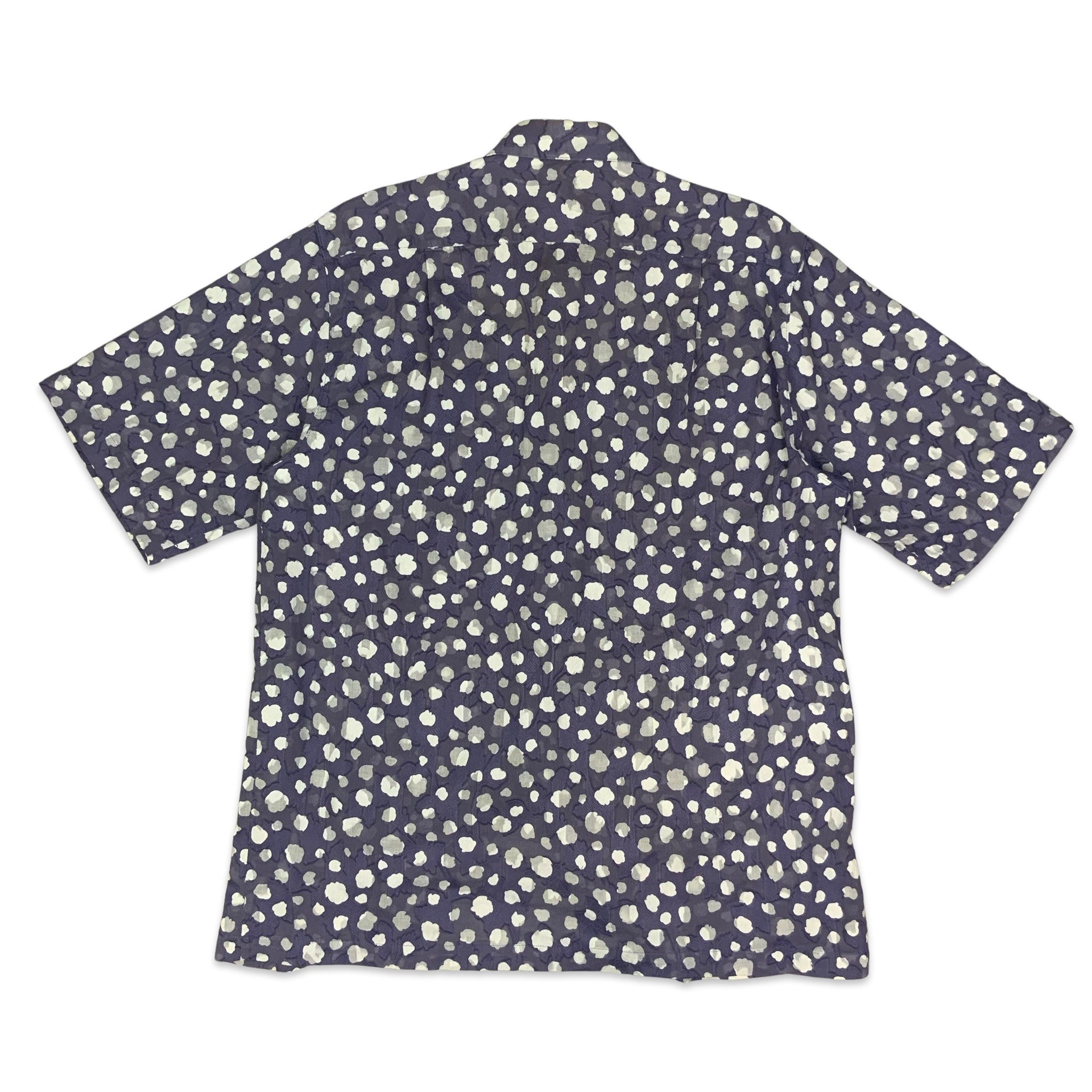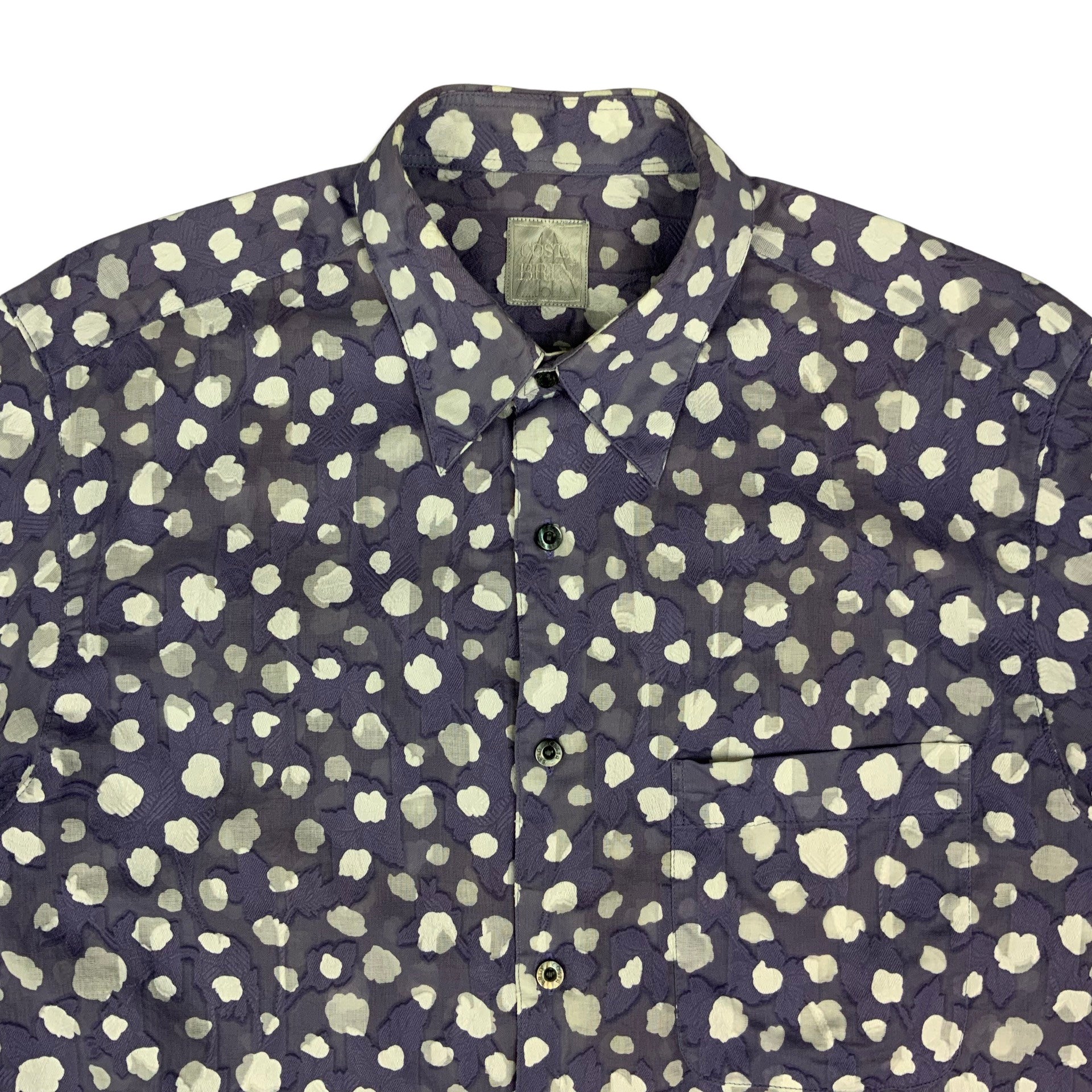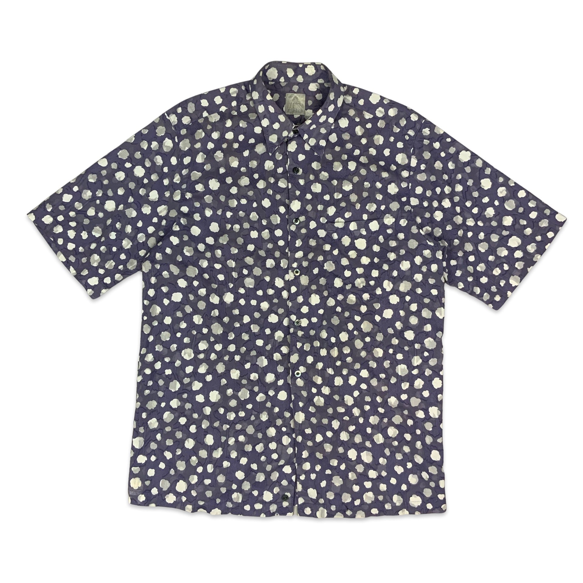 Men’s 90s Y2K short sleeve shirt. Sheer lilac floral fabric with white cloud print. Grey iridescent buttons.