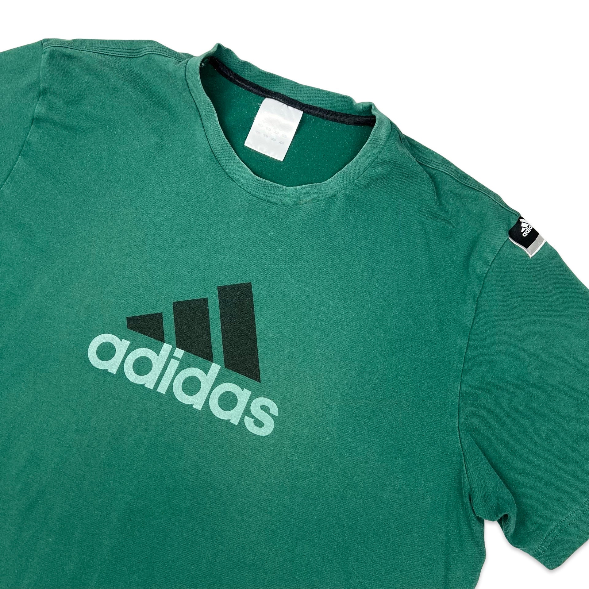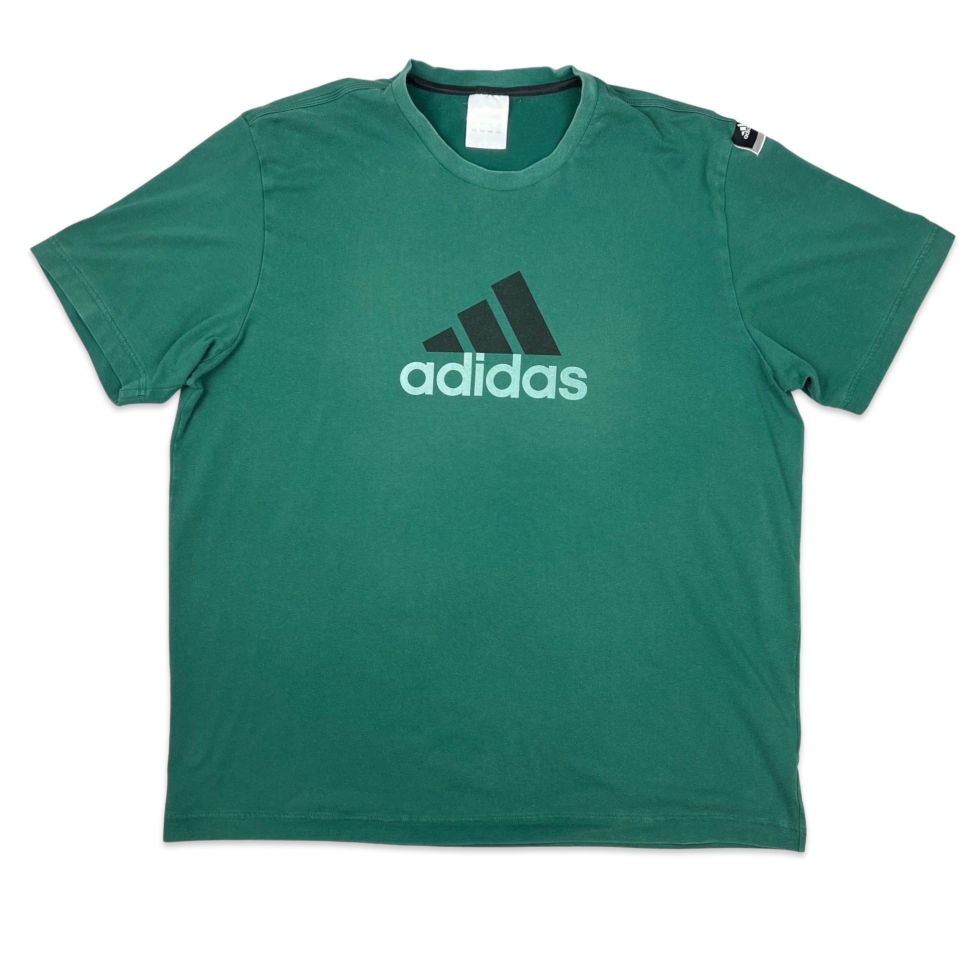 Preloved Adidas green tee with large front print of logo on chest. Neck label has faded.