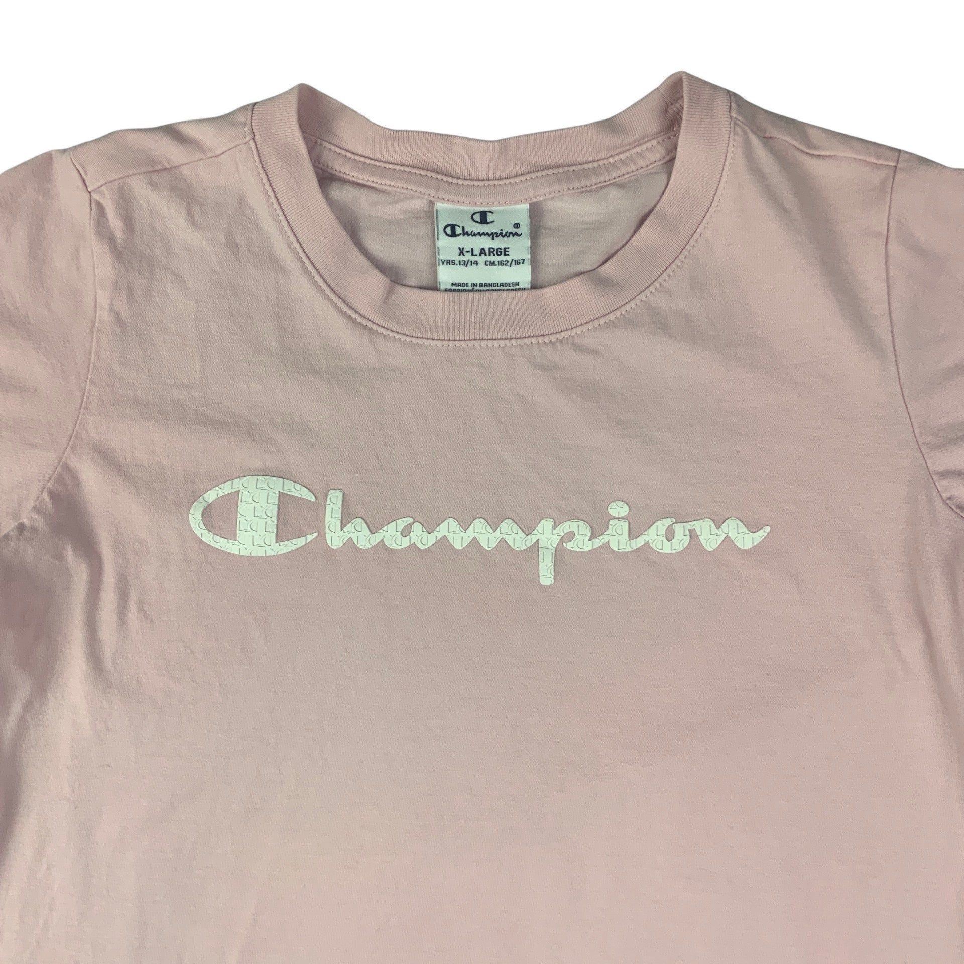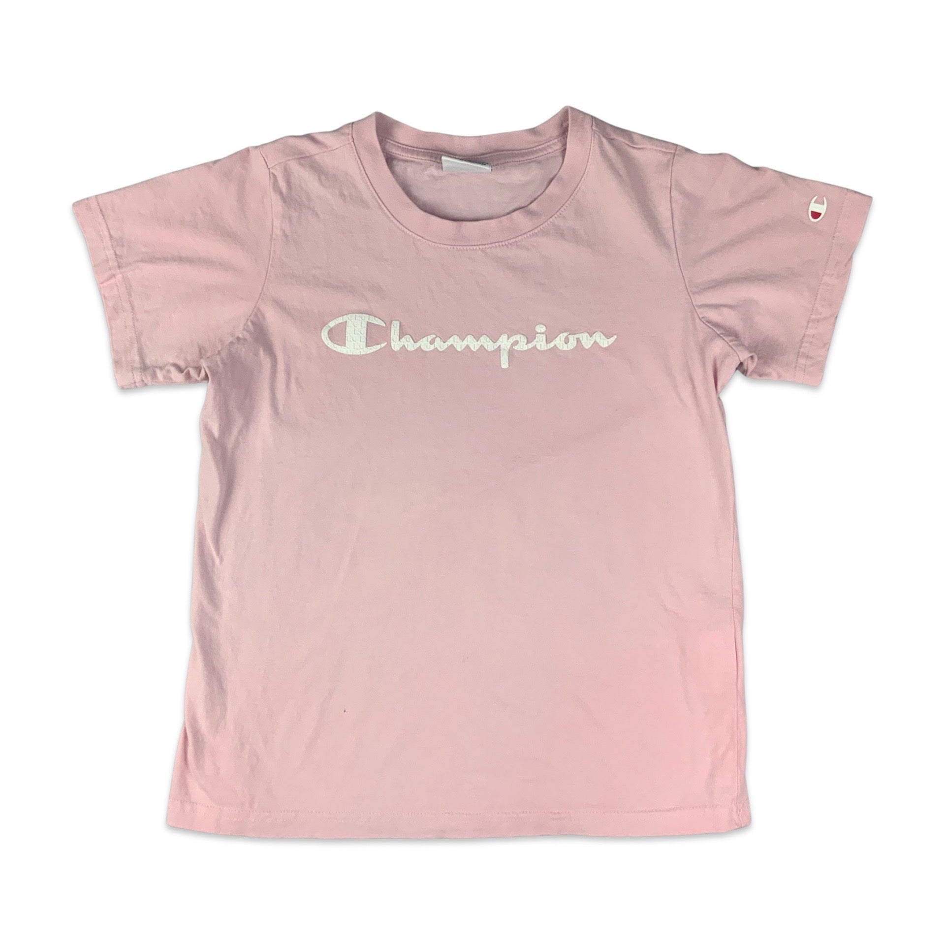 Vintage women’s 90s Champion short sleeve baby pink t-shirt with textured logo design on chest.