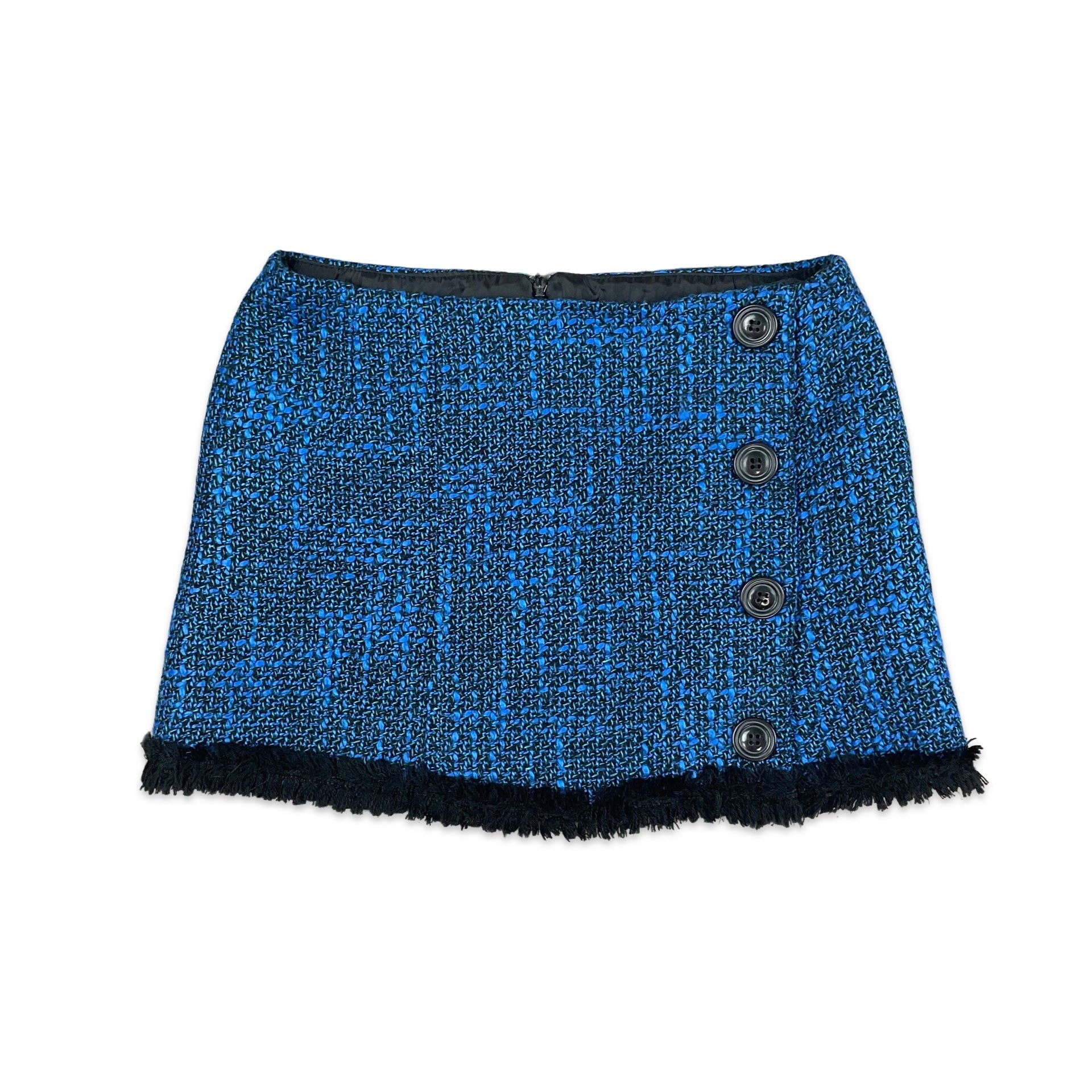 Women’s 90s woven boucle skirt. Blue, teal and black colourway. Black trim on hem. Back zip fastening, buttons on front aren’t functional. Acrylic and polyester. Italian Brand.