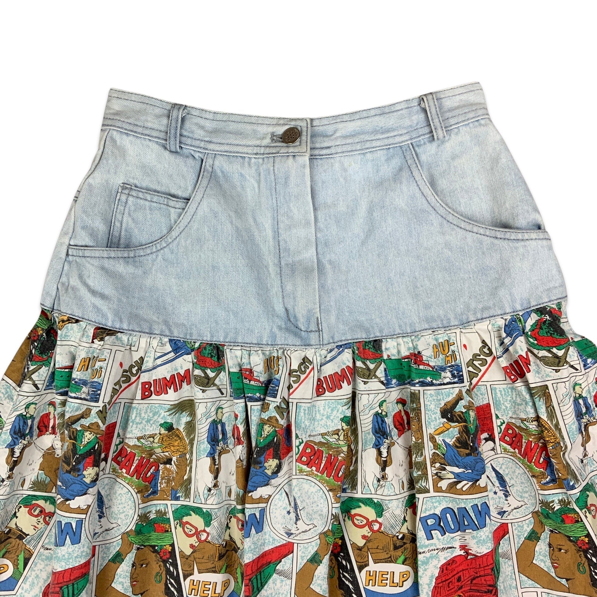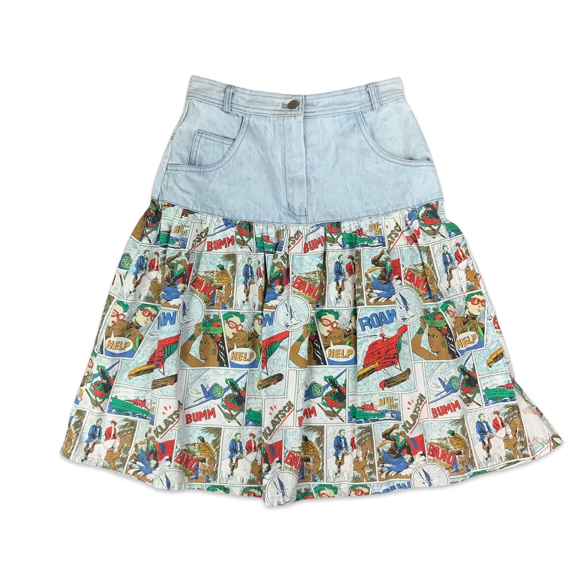 Women’s 90s denim mid length skirt. Light denim with novelty comic print pleated skirt. Has side slit (7.5”) and two front pockets.