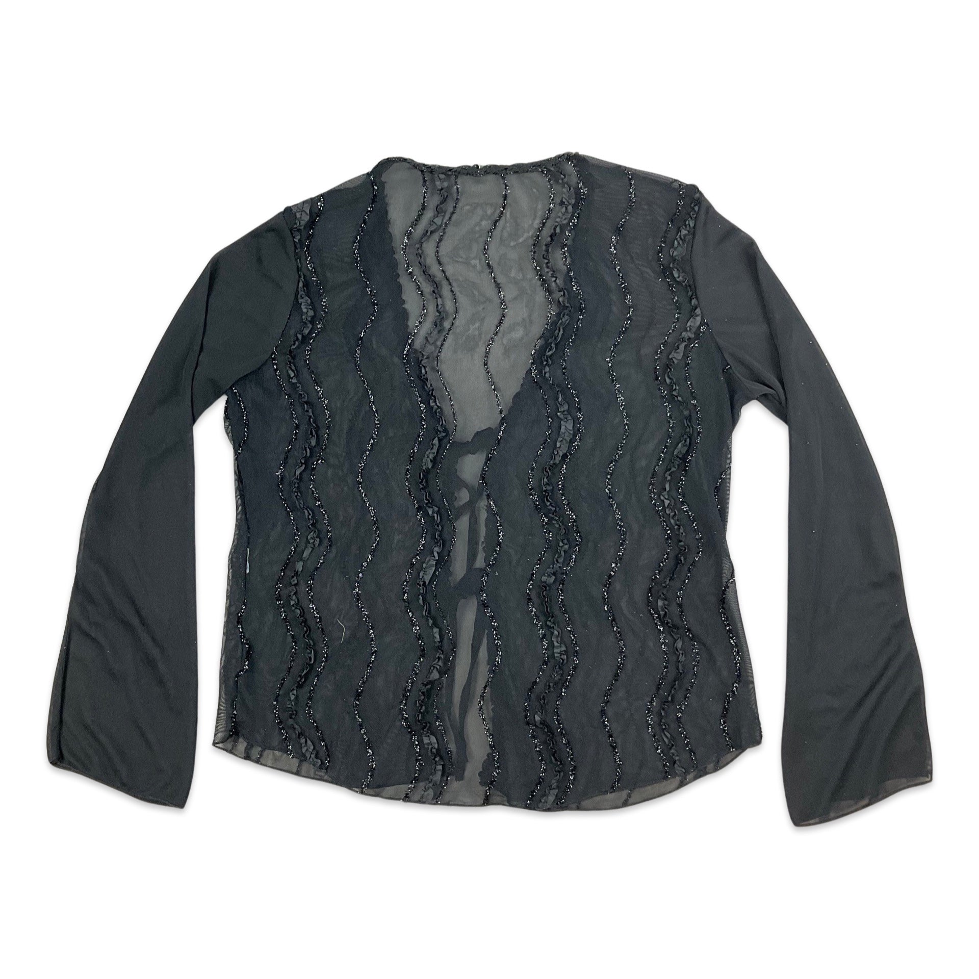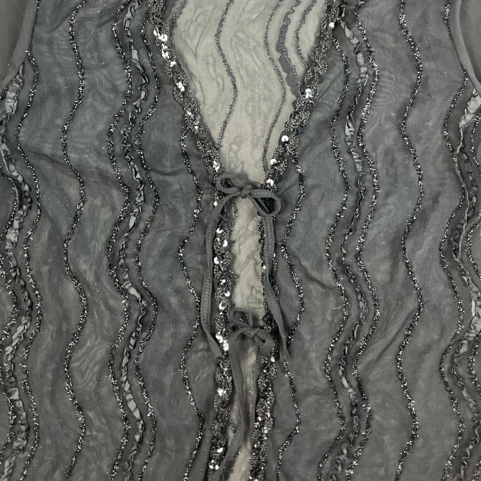 Women’s 90s long sleeved tie front cardigan. Black sheer fabric with striped embellished detail.