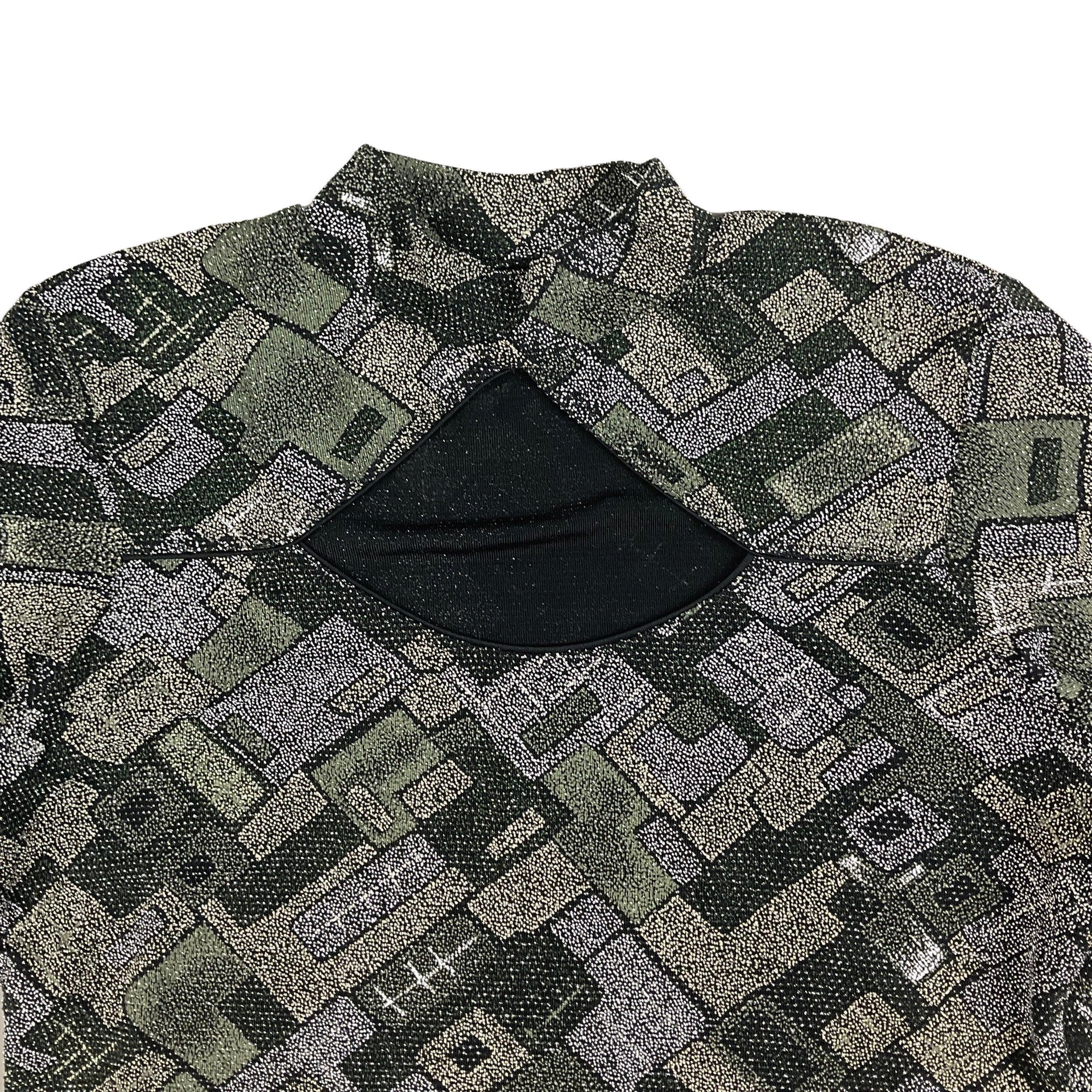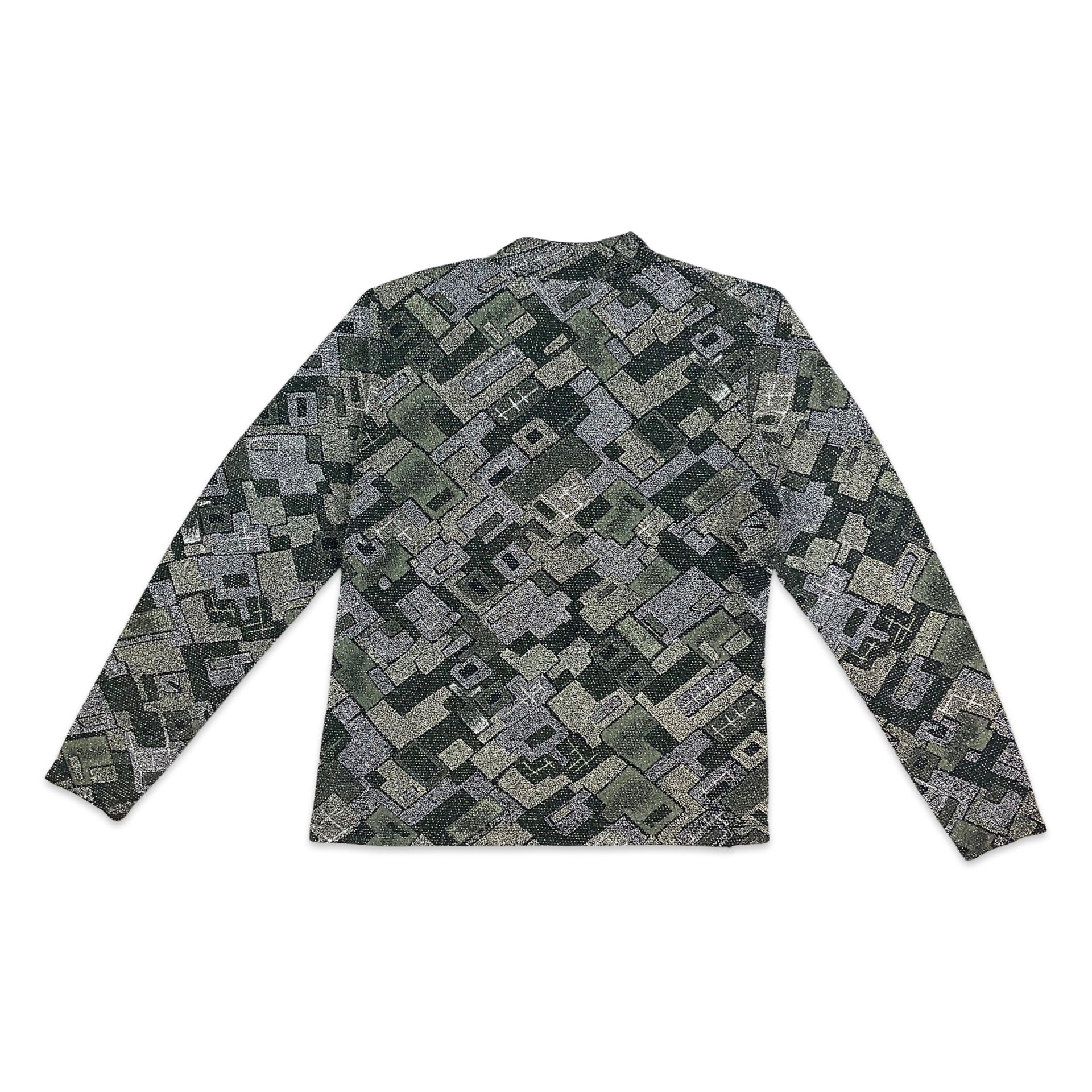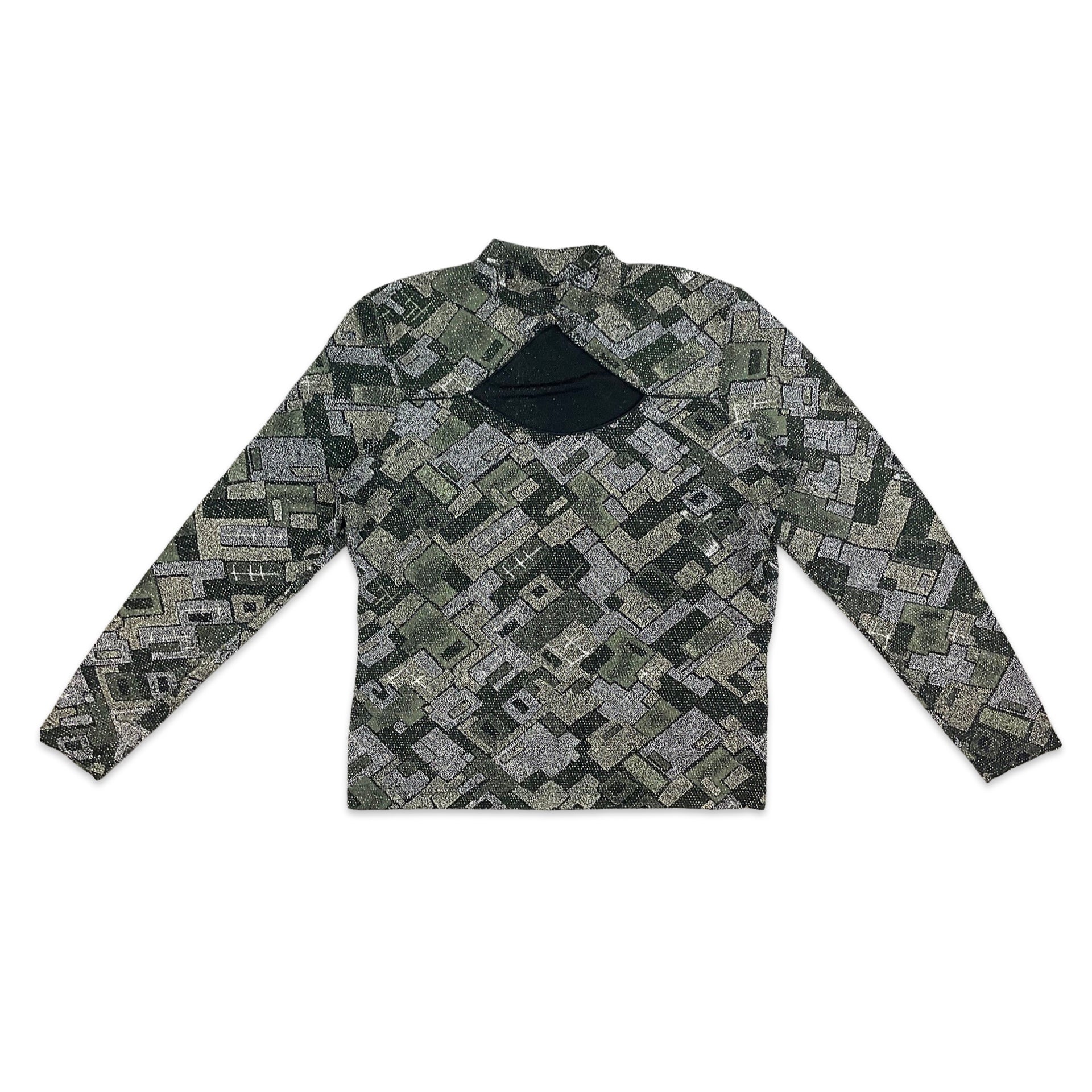 Women’s 90s long sleeved high neck top. Cleavage cut out. Textured sparkly fabric, black, silver and khaki green geometric pattern. Fabric has some stretch.