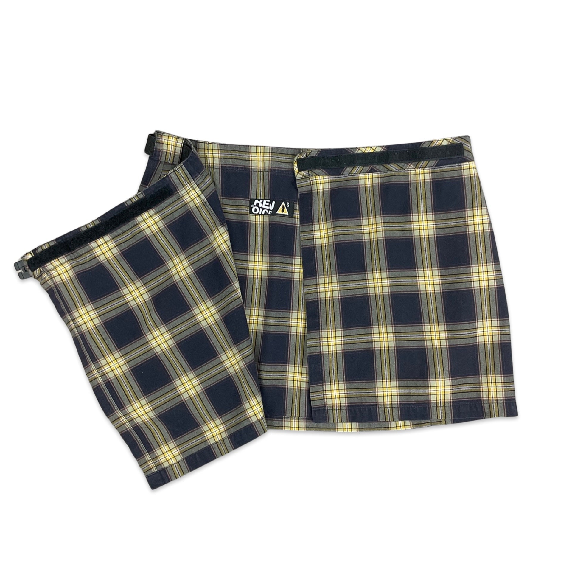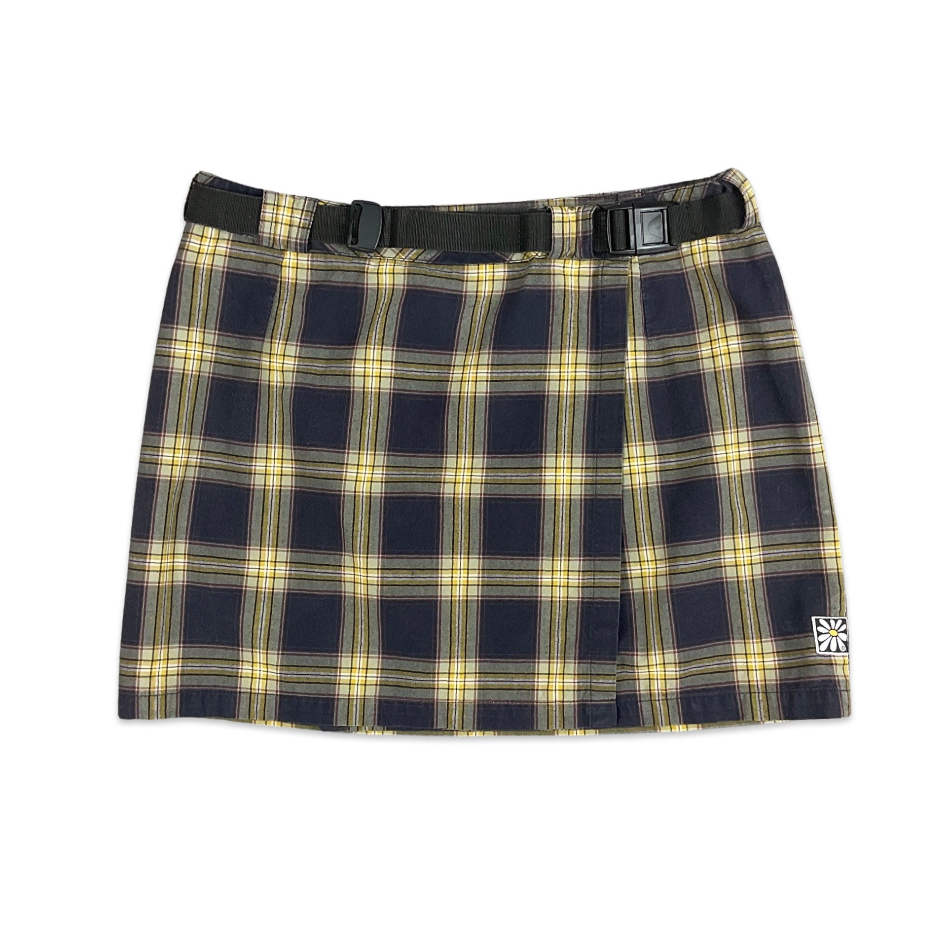 Women’s 90s wrap around mini skirt. Purple, yellow, navy and white tartan. Black plastic buckle belt included. Velcro fastening inside.