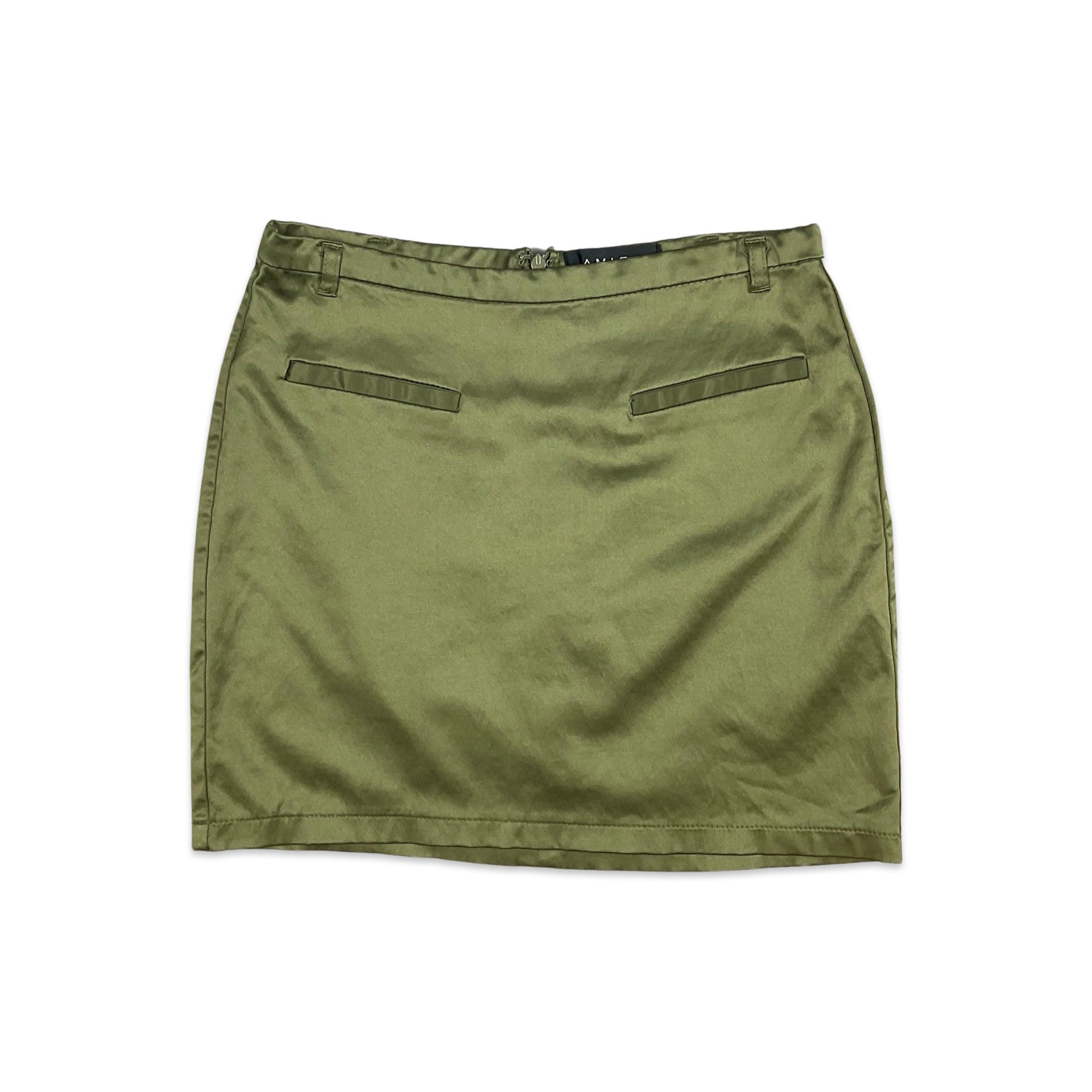 Women’s 90s high waisted bodycon mini skirt. Metallic khaki green colour, soft satin like stretch fabric. Small belt loops, fake front pockets. Zip up back fastening.