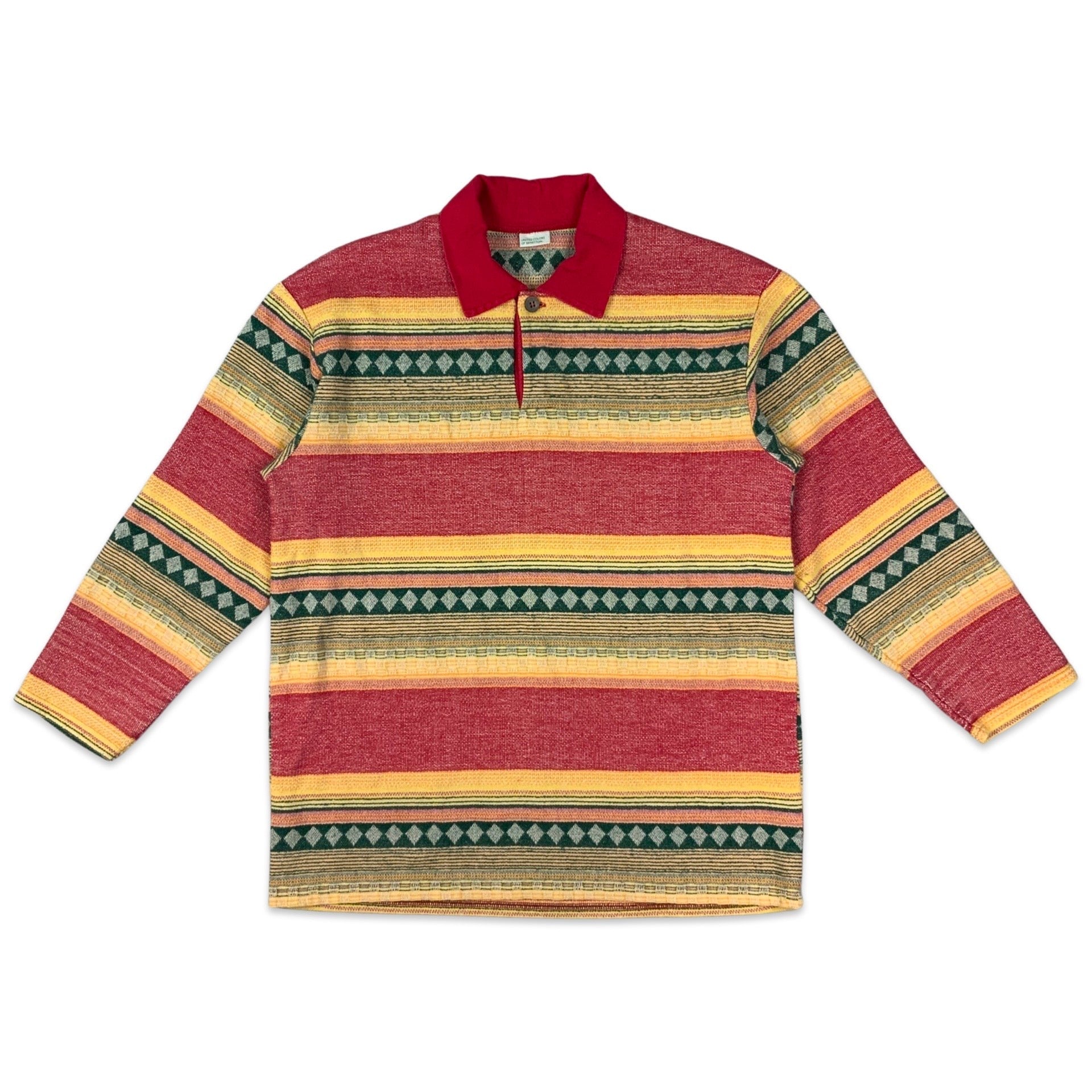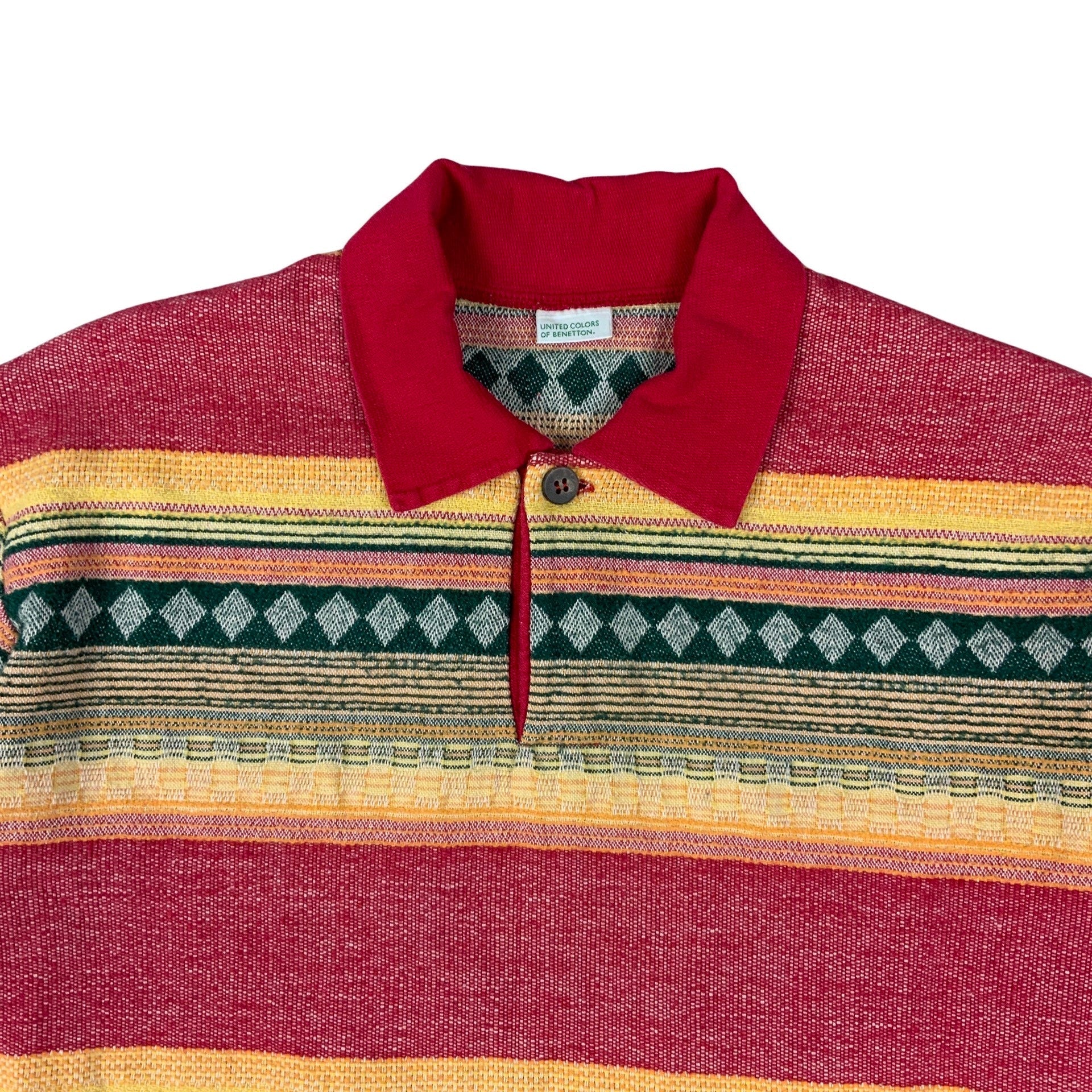 Vintage Benetton Red Yellow Aztec Geometric Print Polo Shirt S M