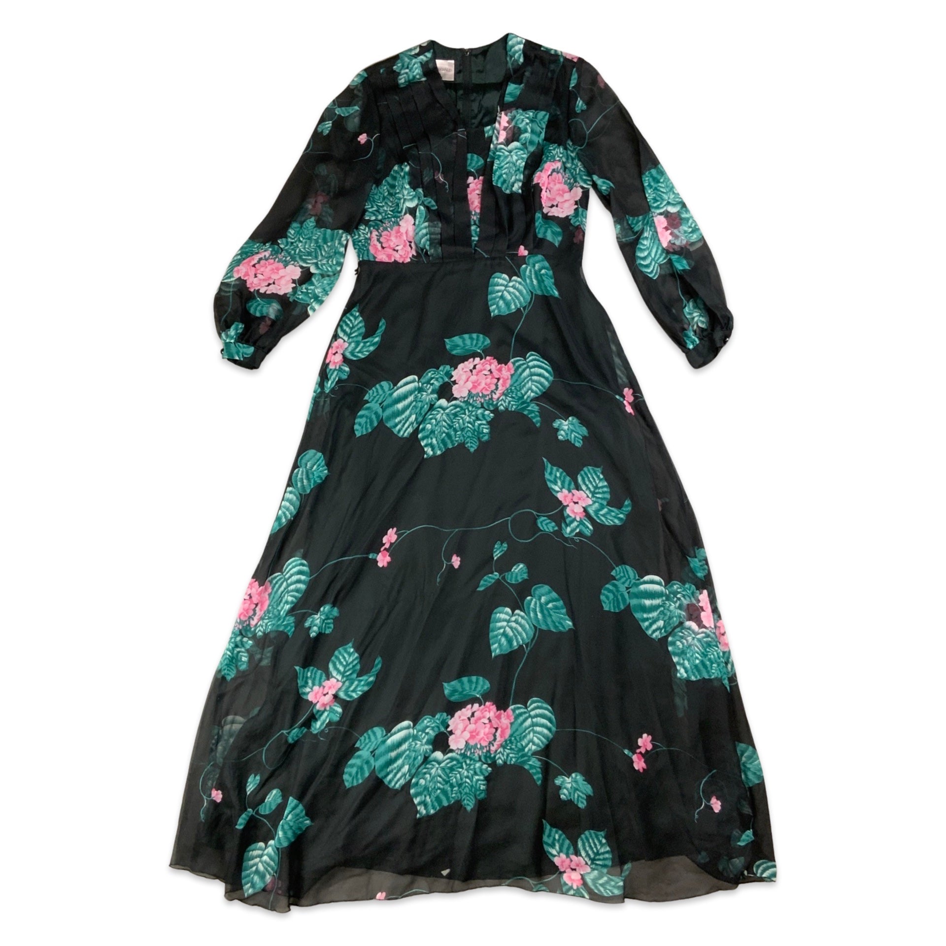 Vintage 70s Black Pink & Green Floral Maxi Dress 10 12