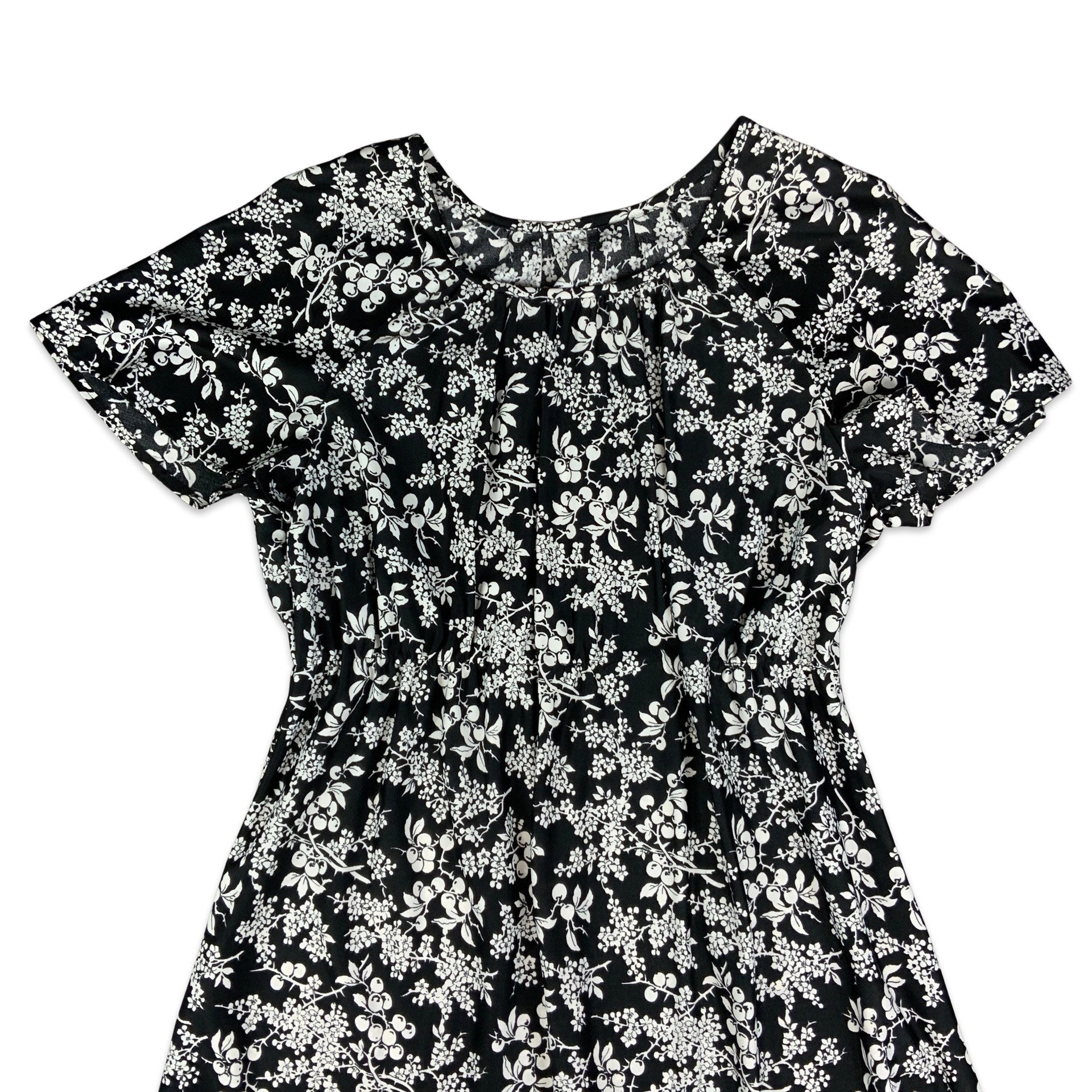 Women’s vintage short bell sleeved, mid length dress with elasticated waist band. Black and white floral pattern. Lightweight fabric.