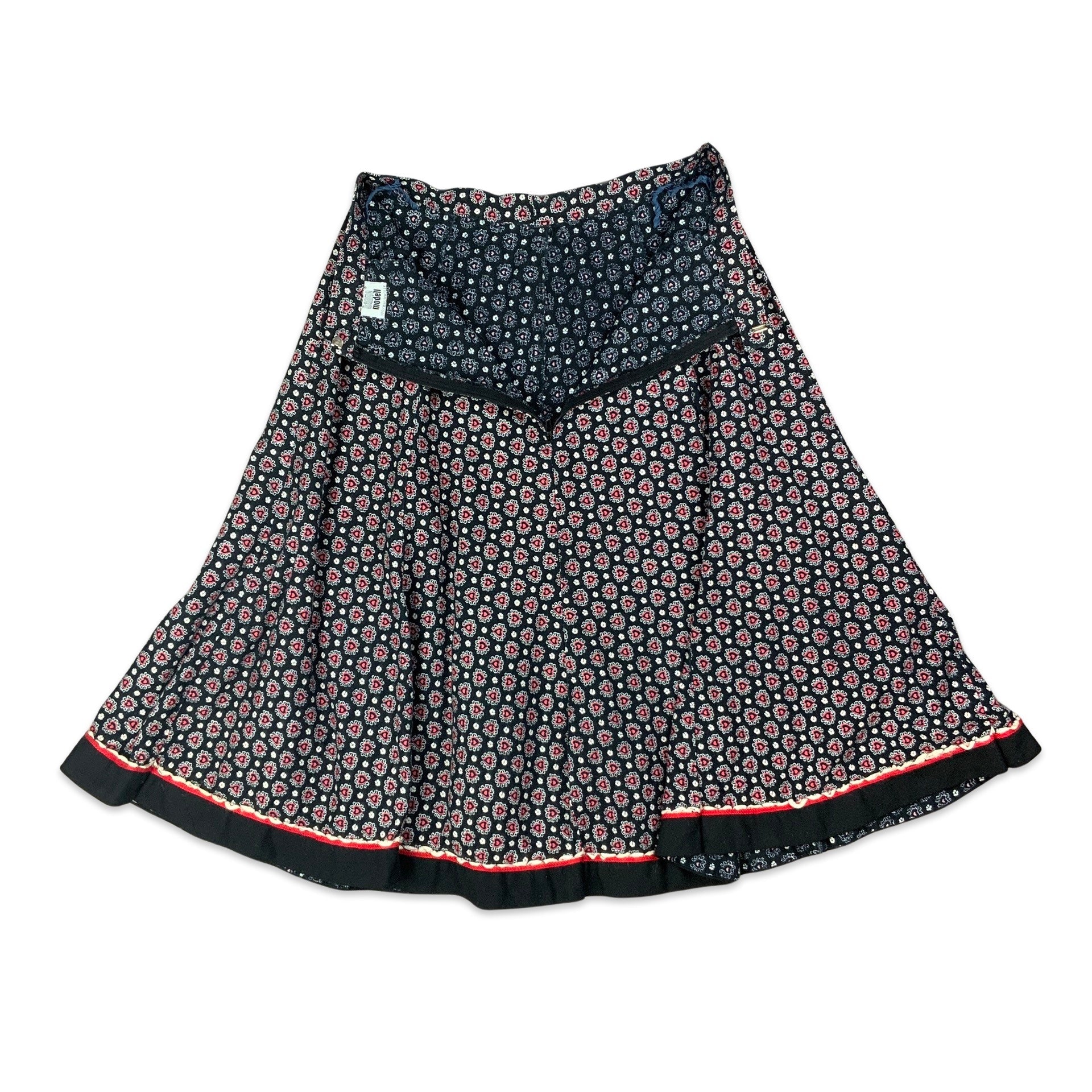 Women’s vintage mid length skirt. 100% Cotton, black with white and red heart and flower print. Back zip fastening.