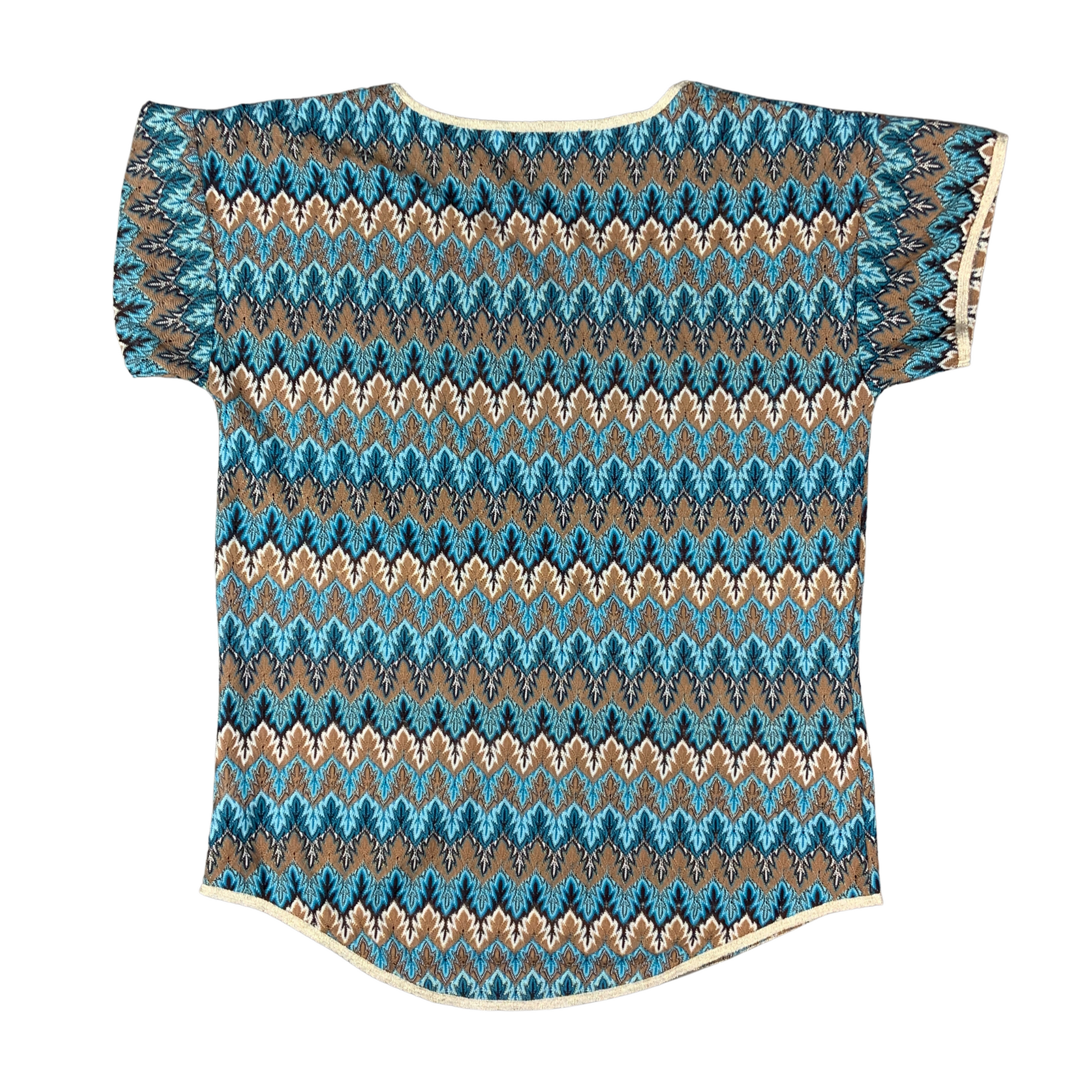 Women’s vintage netted T-shirt. Blue brown and beige floral pattern with sparkly gold trim around neckline and hem.