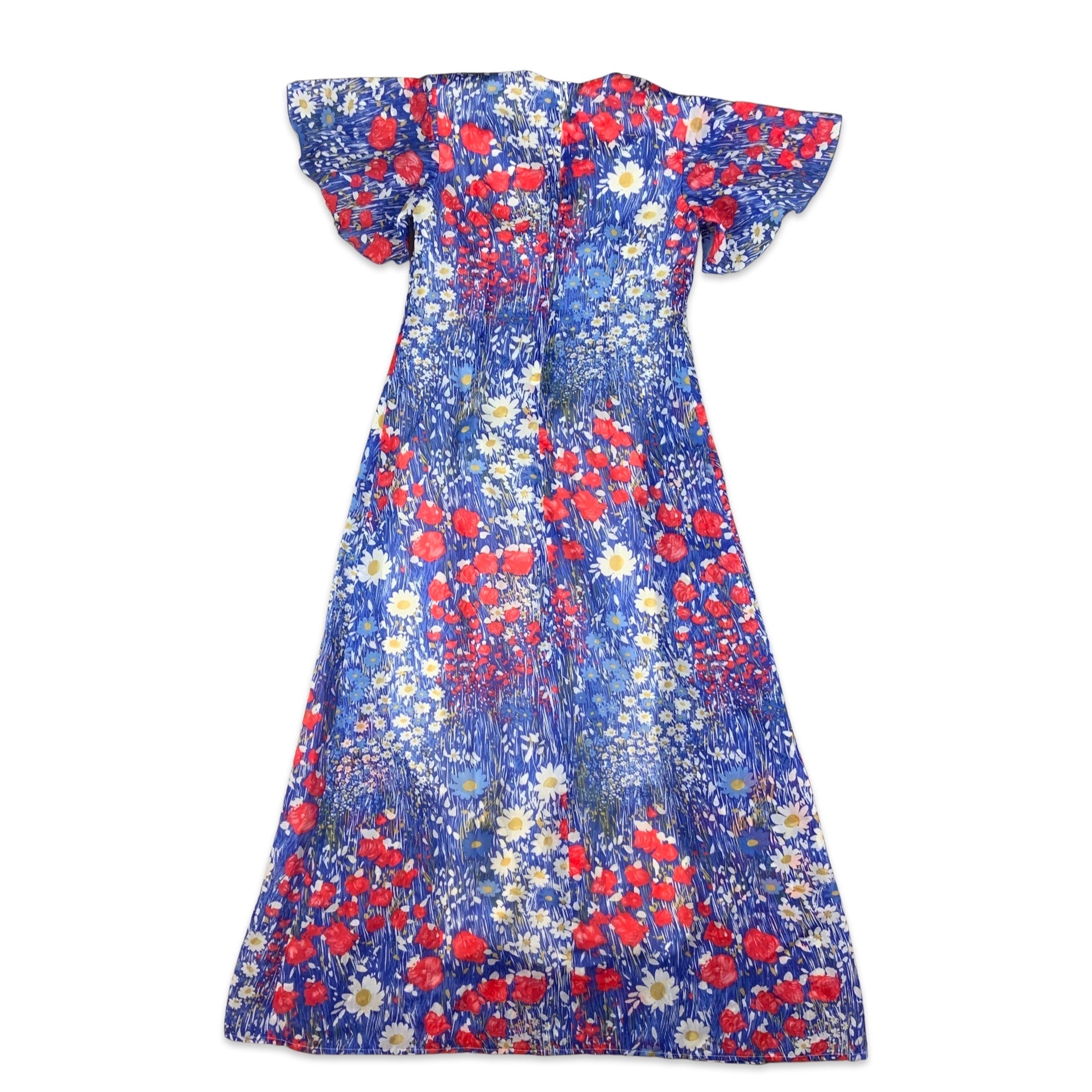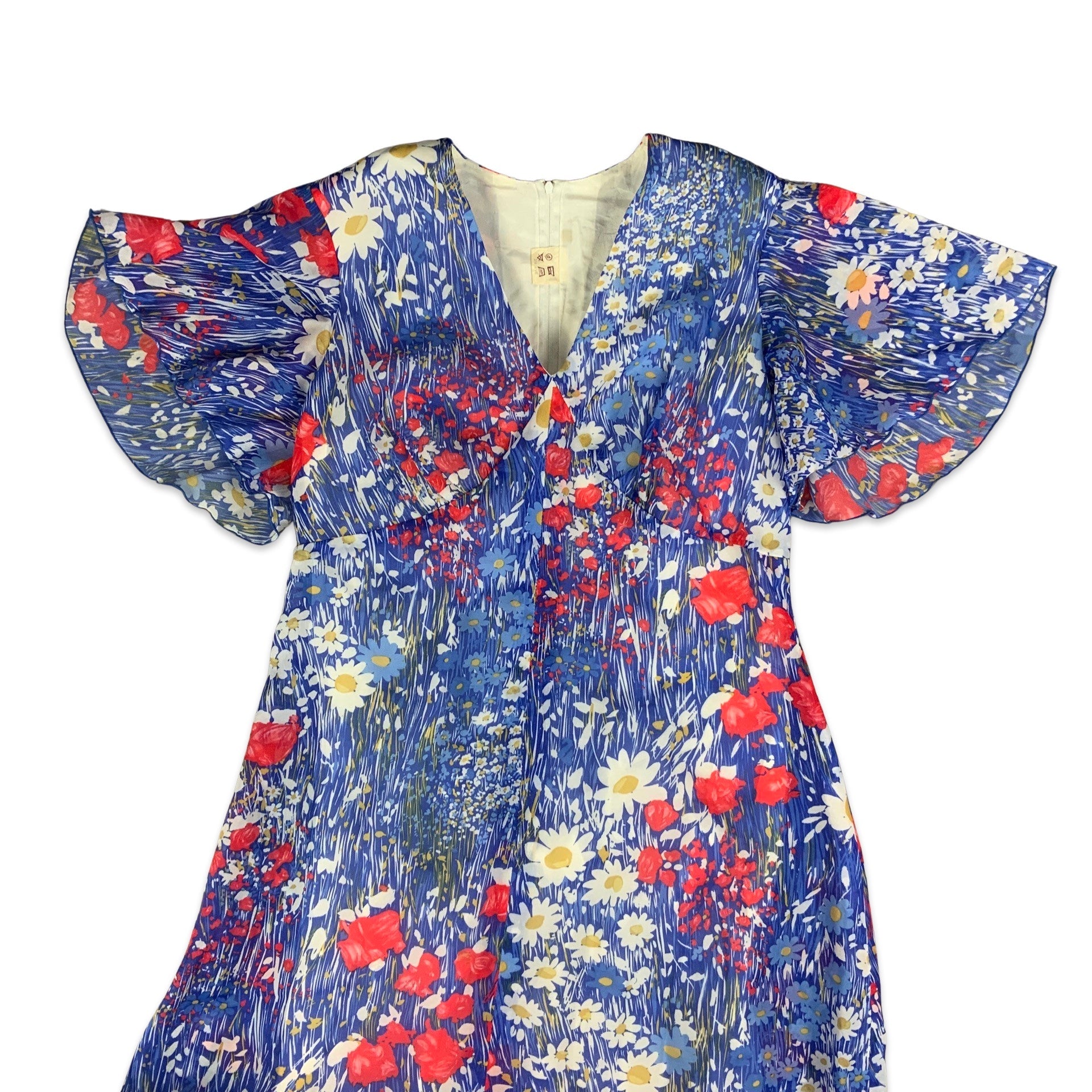 Women’s vintage maxi dress. V neck and floaty, short bell sleeves. Blue, red, yellow and white floral print. Sheer fabric with a lining. 100% polyester.