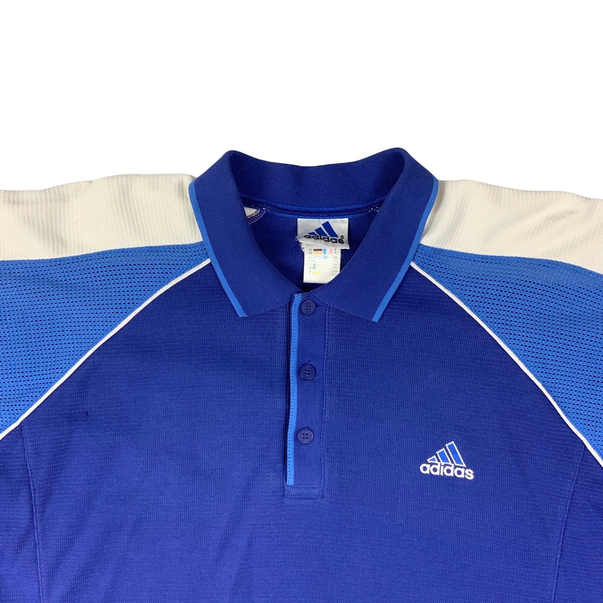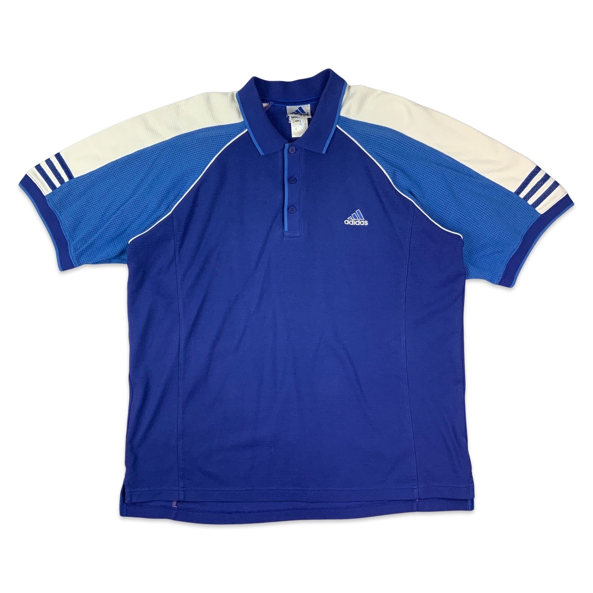 Men’s vintage Adidas sports polo. Blue & white colour way, mesh fabric on sleeves. 3 button up collar.